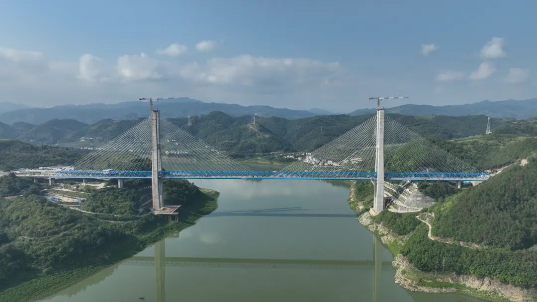 汉江特大桥位于十堰市,跨越丹江口水库库区,是世界最大跨度梁桁组合结构高铁斜拉桥,也是西十高铁全线控制性工程。该桥全长917.45米,设计主跨420米一跨飞跃汉江。