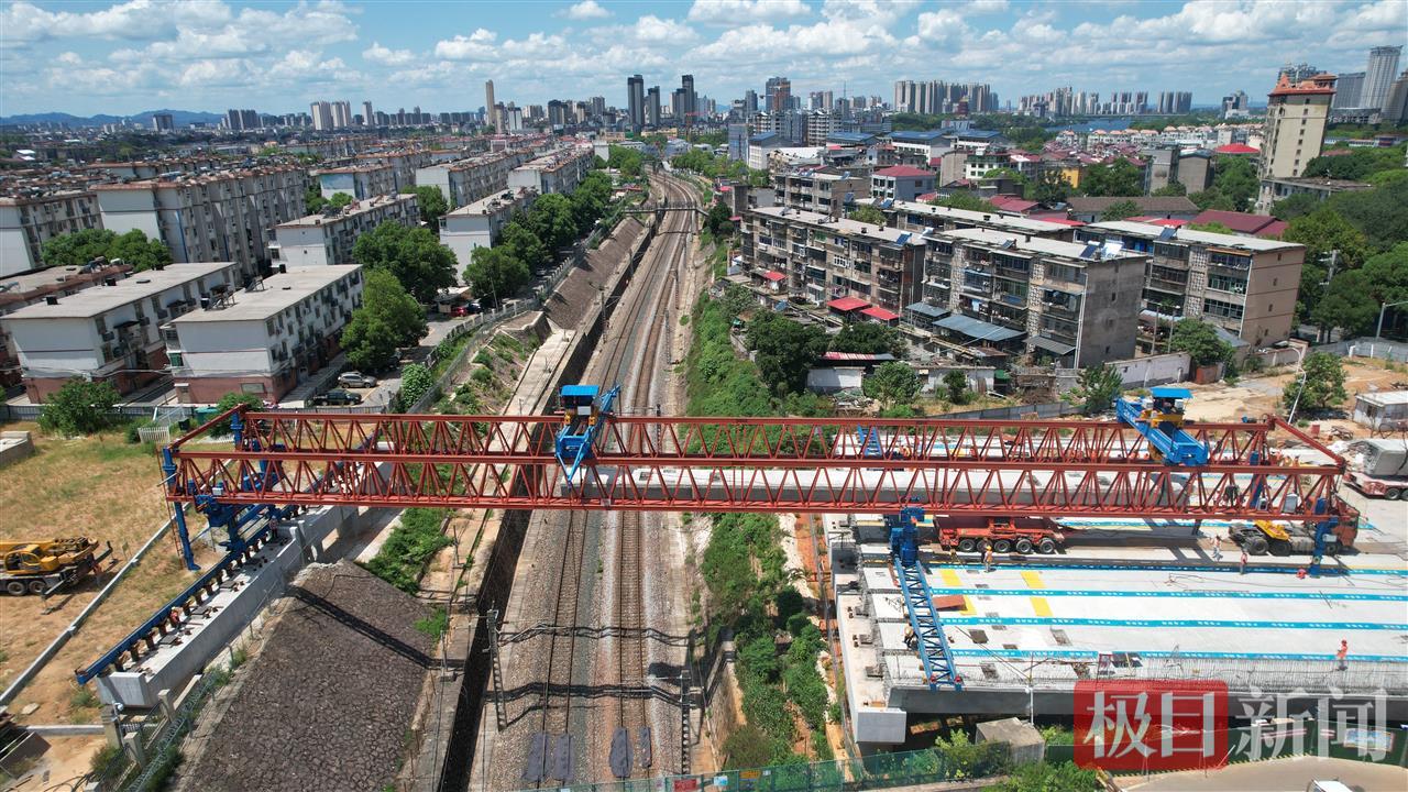 当日13时,项目团队利用铁路“天窗期”,将两片各重162吨的40米箱梁精准架设在沪昆铁路线上方。施工采用智能化架桥设备,通过三维定位系统实现±2毫米的落梁精度。此次成功跨越沪昆上行线和环到线两条铁路干线,为后续11股轨道跨越施工奠定基础。