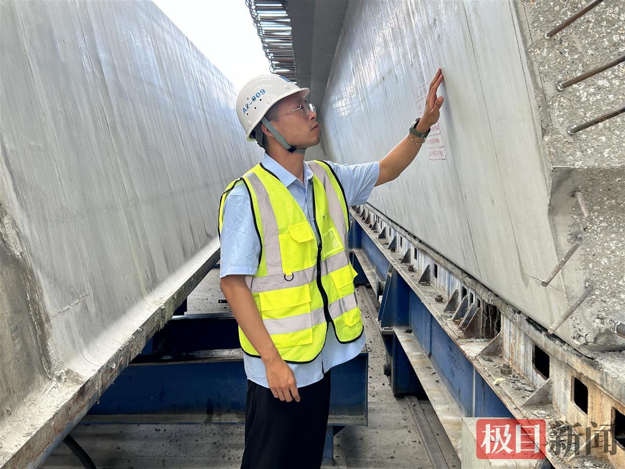 去年12月启动梁体架设时,彭龙帆的“较真”让同事印象深刻。“混凝土梁怕温差、怕裂缝,必须从源头控制质量。”为了确保质量,早在2个月前,他就带着团队反复试验,调整温湿度、模板和工艺,就是为了避免梁体出现水波纹。