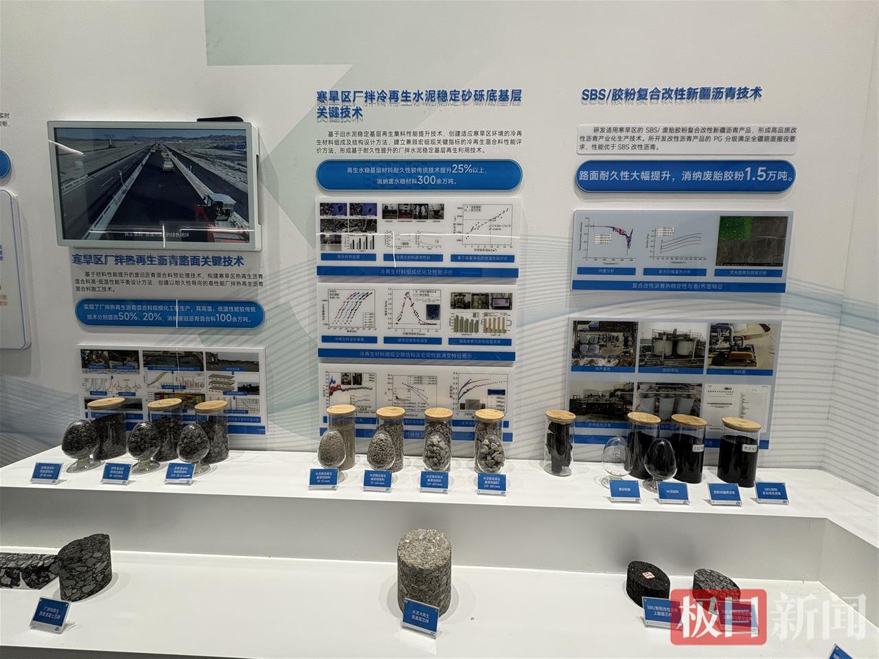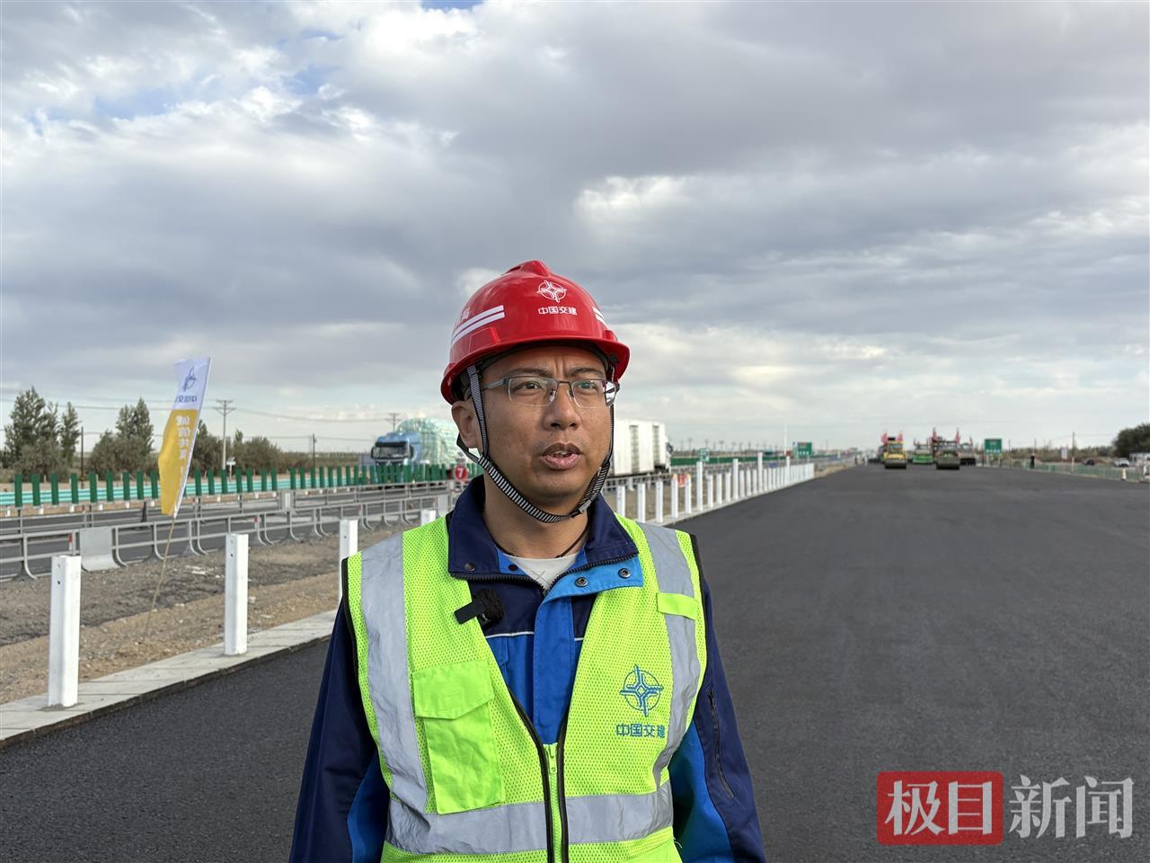 面对极端环境,建设者们拿出了“硬核”应对方案。为攻克近百摄氏度的温差,项目将沥青混凝土面层厚度从常规的18厘米加厚至24厘米,并大规模运用“SBS+胶粉复合改性沥青”,即将基质沥青加入SBS改性的同时加入橡胶粉,改善了沥青的高温及低温性能,有效解决了新疆地区路面高温推移、低温开裂的痛点。