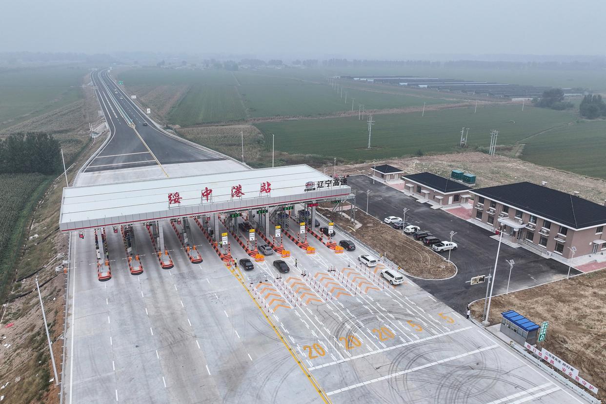 9月27日,车辆从凌绥高速绥中港站收费口进入高速公路(无人机照片)。新华社记者 潘昱龙 摄