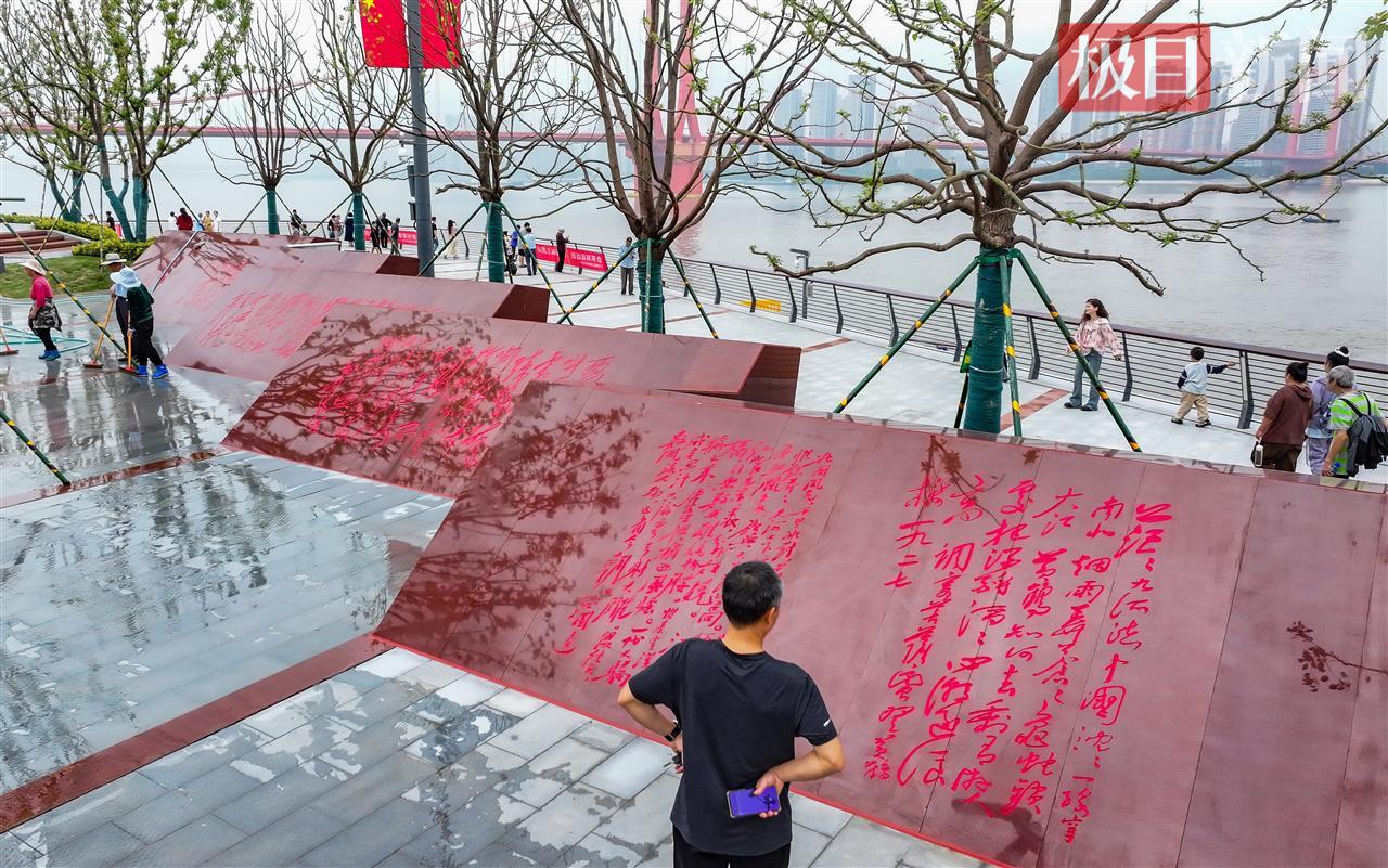 新闻记者现场看到,文化墙上镌刻着《水调歌头·游泳》等手迹,唤起“一桥飞架南北,天堑变通途”的历史记忆。
