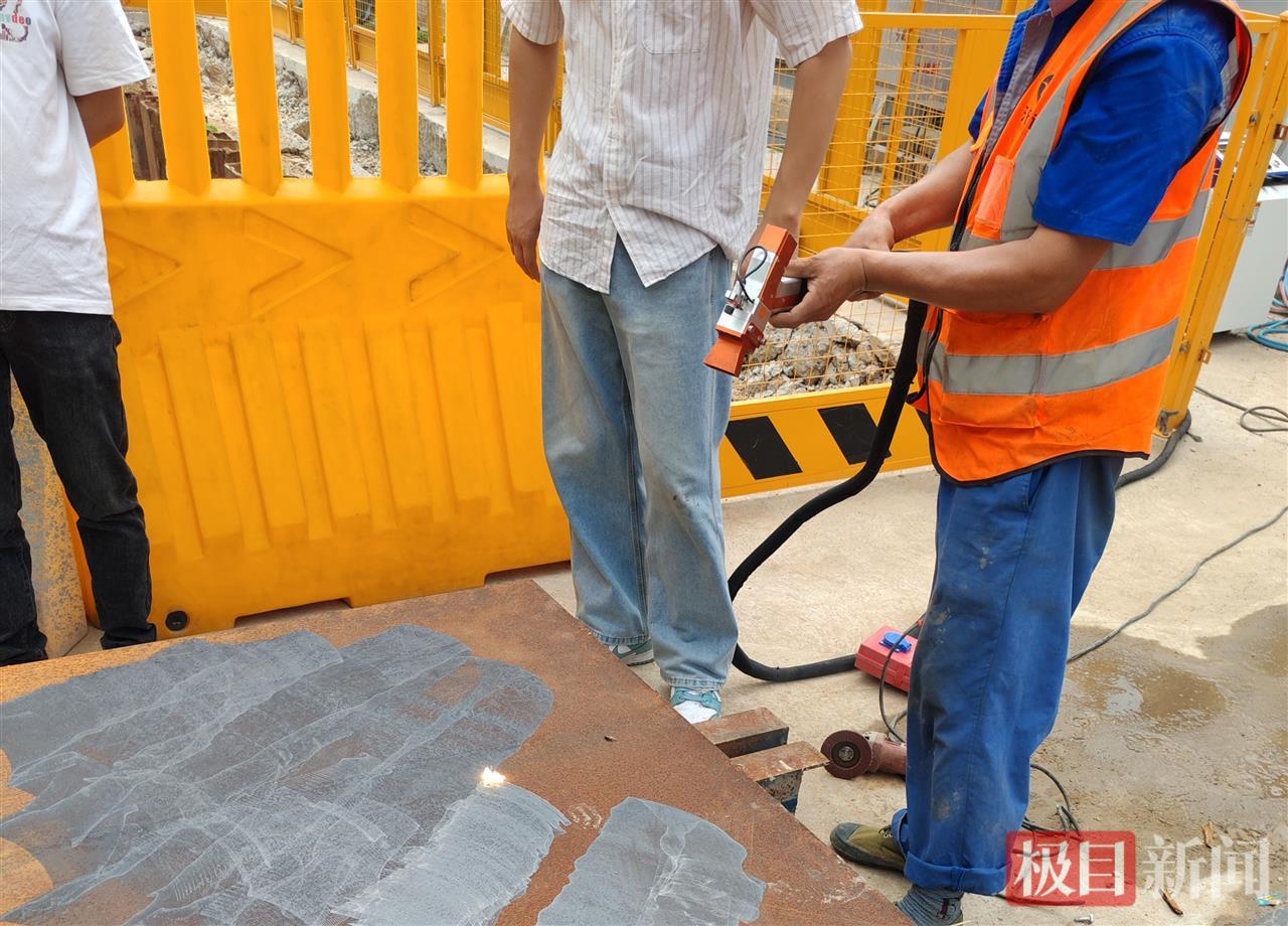 对此,武汉天创建设集团项目团队通过攻关,如今项目创新引入激光除锈技术,通过高能量密度的脉冲激光束照射金属表面,使锈层直接气化蒸发,既实现了物理无接触处理,有效避免喷砂、钢丝刷等机械方法可能造成的钢模划伤、变形或尺寸改变,又能精准应对边角、焊缝、凹槽等传统工艺难以触及或易损伤的部位,大幅减少除锈过程中的粉尘污染。