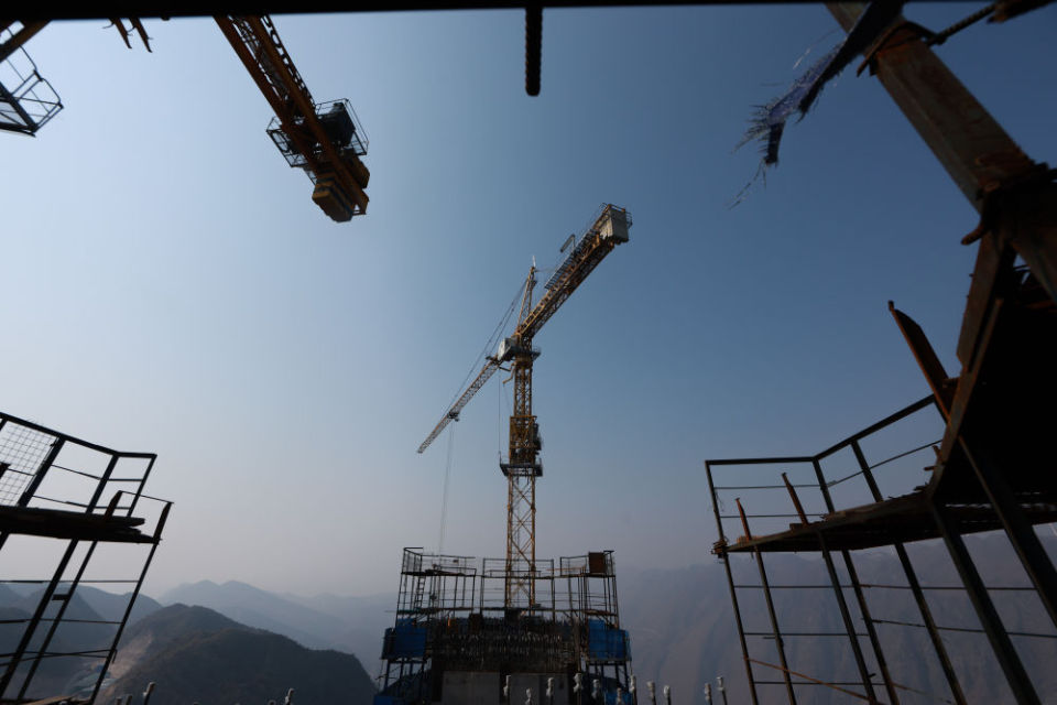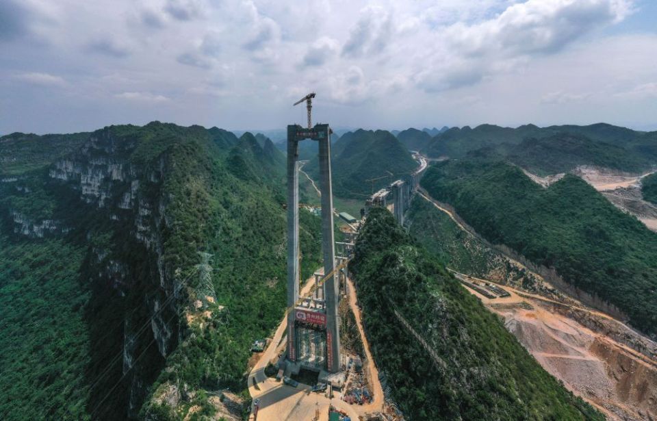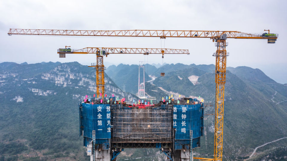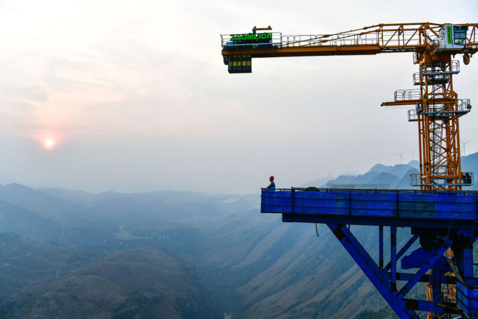 2024年3月26日,工程师在贵州花江峡谷大桥的桥塔上查看桥梁建设进度。新华社记者 杨文斌 摄