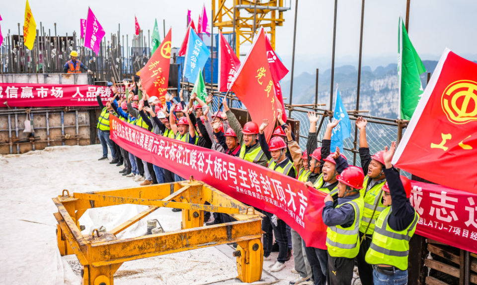 ↑ 2023年10月24日,建设者在贵州花江峡谷大桥5号主塔上庆祝封顶。新华社记者 陶亮 摄