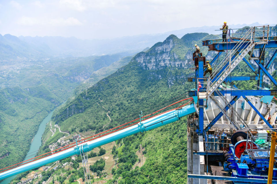 ↑ 2025年6月6日,工人在贵州花江峡谷大桥桥塔顶上施工。新华社记者 杨文斌 摄