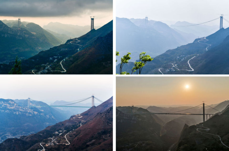 ↑ 拼版照片:左上图为桥塔建设中的贵州花江峡谷大桥(2023年11月7日摄),右上图为施工猫道搭建中的贵州花江峡谷大桥(2024年3月26日摄),左下图为合龙前的贵州花江峡谷大桥(2025年1月14日摄),右下图为施工猫道拆除中的贵州花江峡谷大桥(2025年6月11日摄)。新华社记者 杨文斌 摄