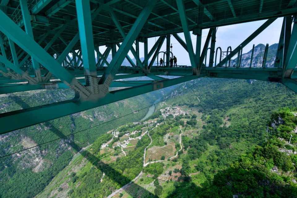 ↑ 2025年6月11日,工人在贵州花江峡谷大桥上安装观景长廊。新华社记者 杨文斌 摄