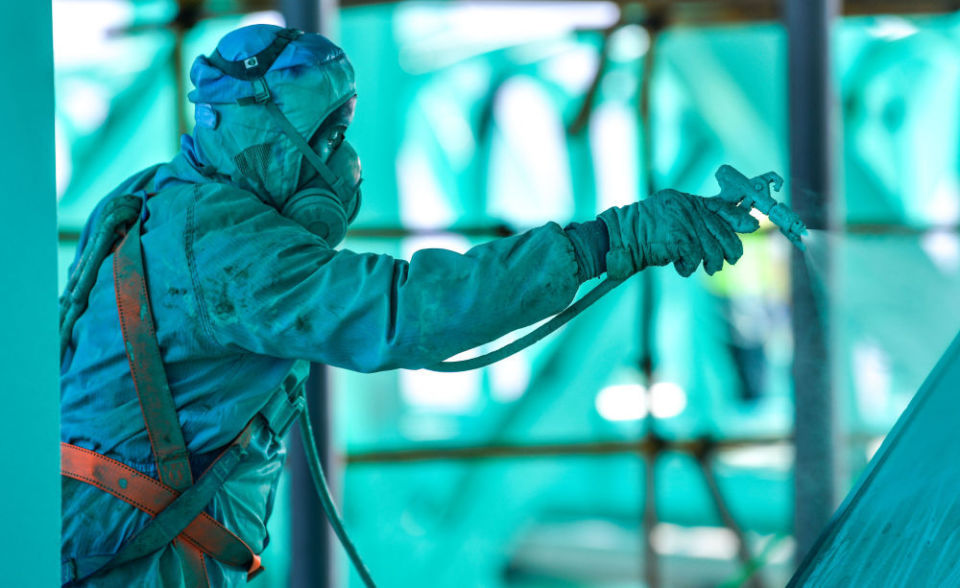 ↑ 2025年6月11日,工人在贵州花江峡谷大桥上给桥体喷漆。新华社记者 杨文斌 摄