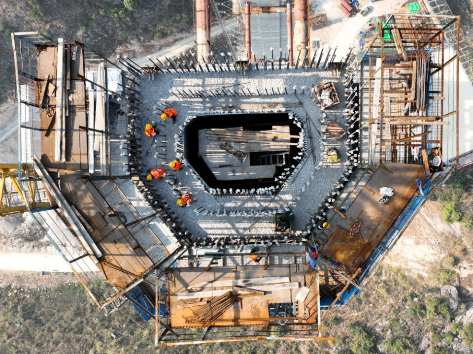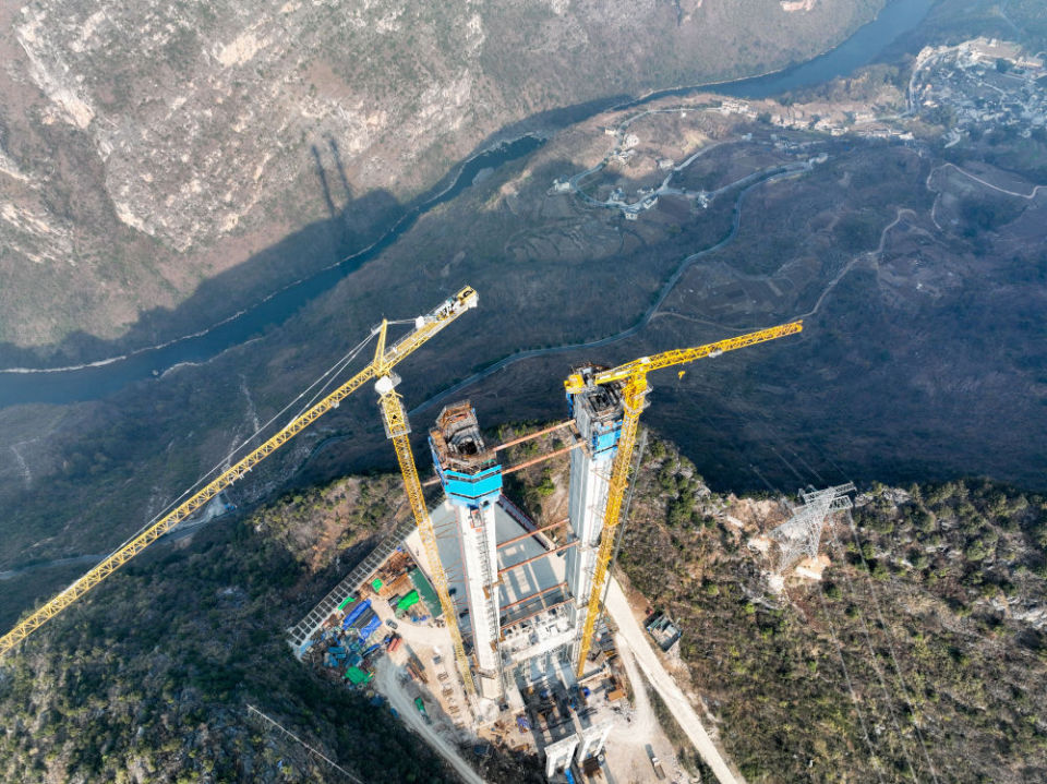↑ 2023年2月1日拍摄的贵州花江峡谷大桥主塔施工现场(无人机照片)。新华社记者 欧东衢 摄