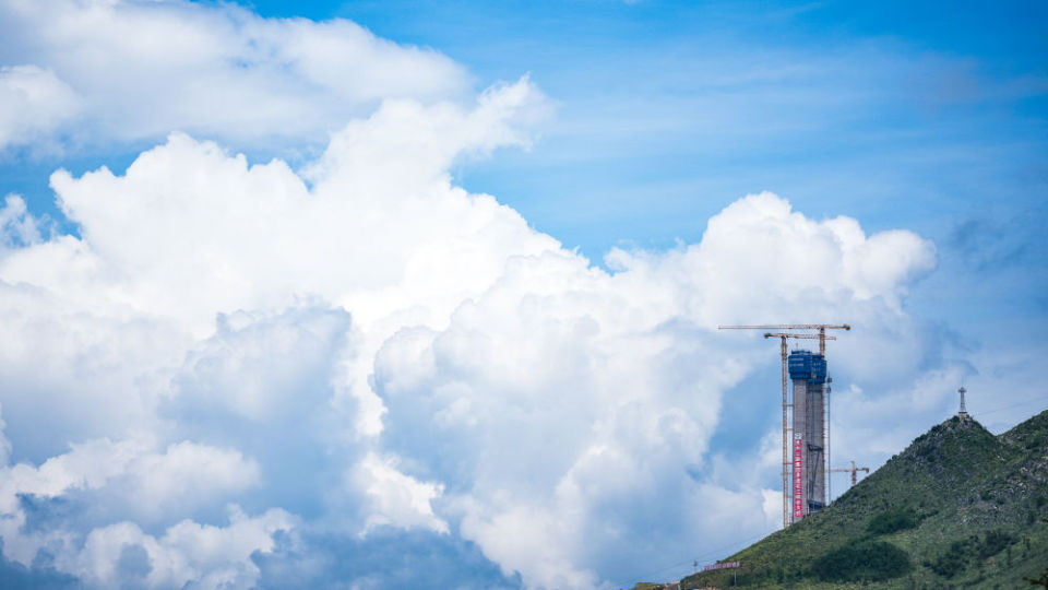 ↑ 修建中的贵州花江峡谷大桥5号主塔(2023年8月3日摄)。新华社记者 陶亮 摄