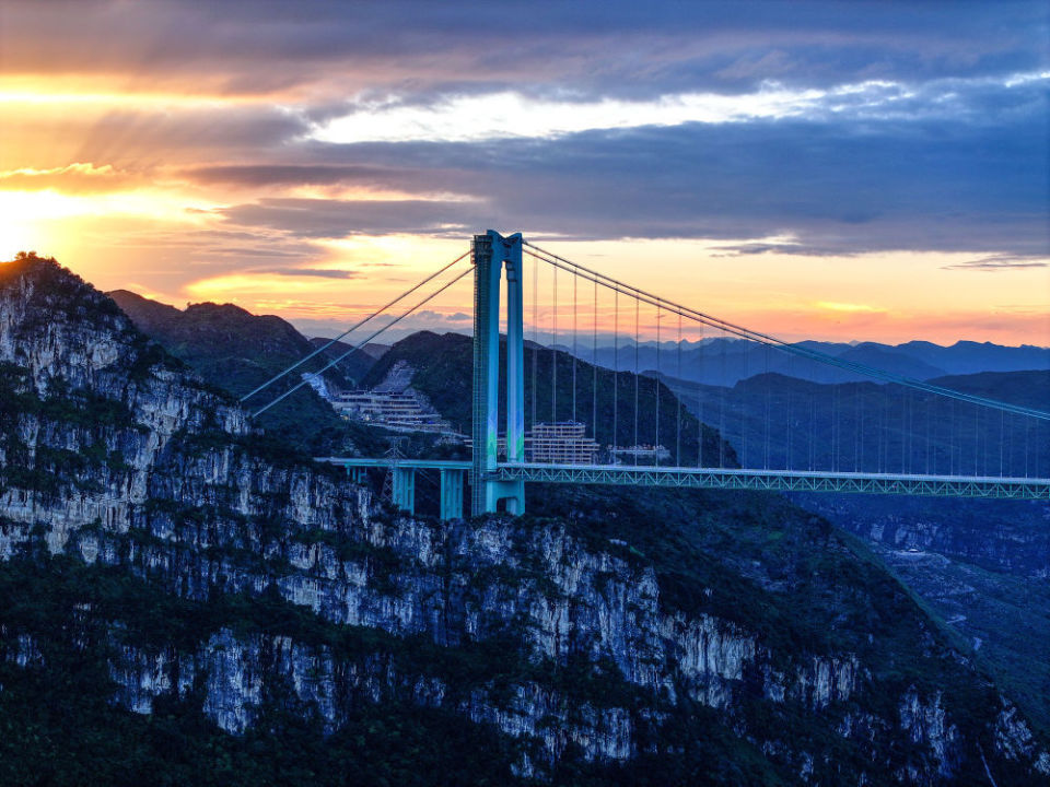 ↑ 2025年9月27日拍摄的晚霞中的贵州花江峡谷大桥(无人机照片)。新华社记者 欧东衢 摄