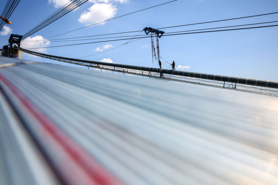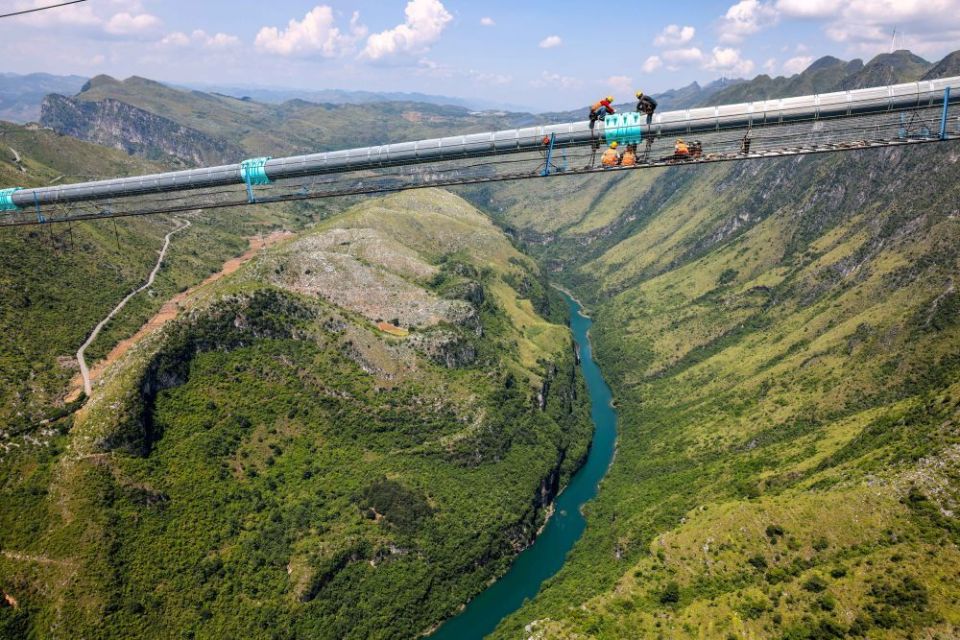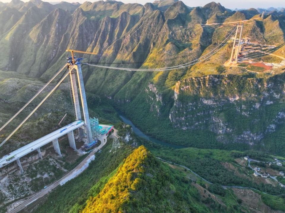 ↑2024年9月4日,工人在贵州花江峡谷大桥的猫道上施工。新华社记者 欧东衢 摄