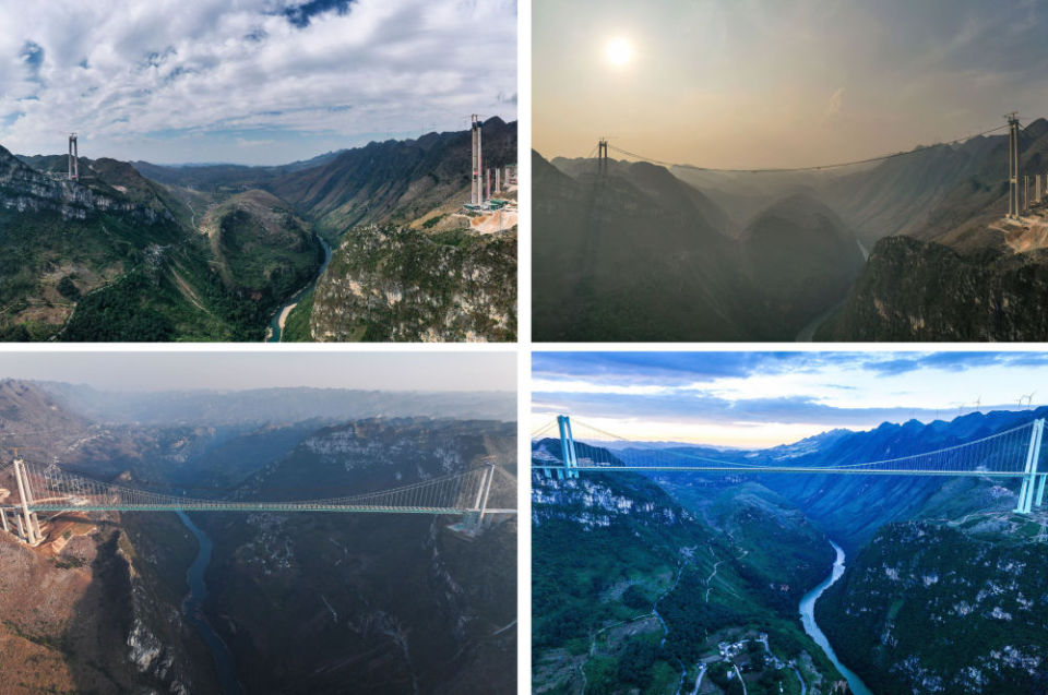 ↑拼版照片:左上图为桥塔建设中的贵州花江峡谷大桥(2023年11月8日摄),右上图为施工猫道搭建中的贵州花江峡谷大桥(2024年3月26日摄),左下图为合龙前的贵州花江峡谷大桥(2025年1月13日摄),右下图为通车前一天的贵州花江峡谷大桥(2025年9月27日摄)。新华社记者 杨文斌 摄