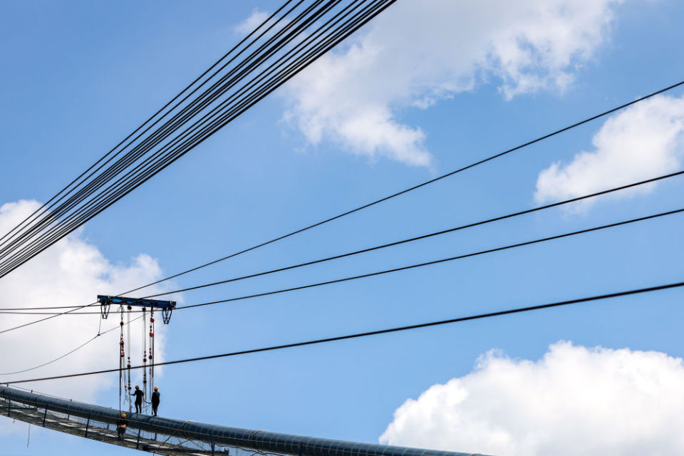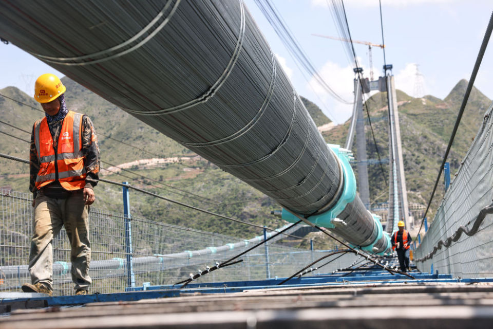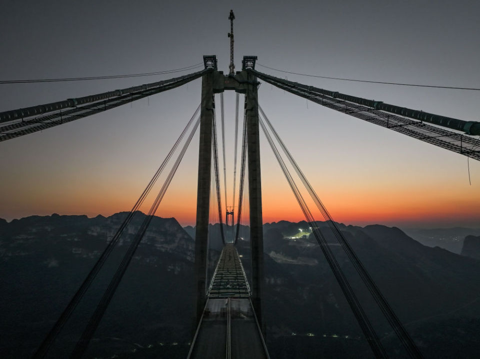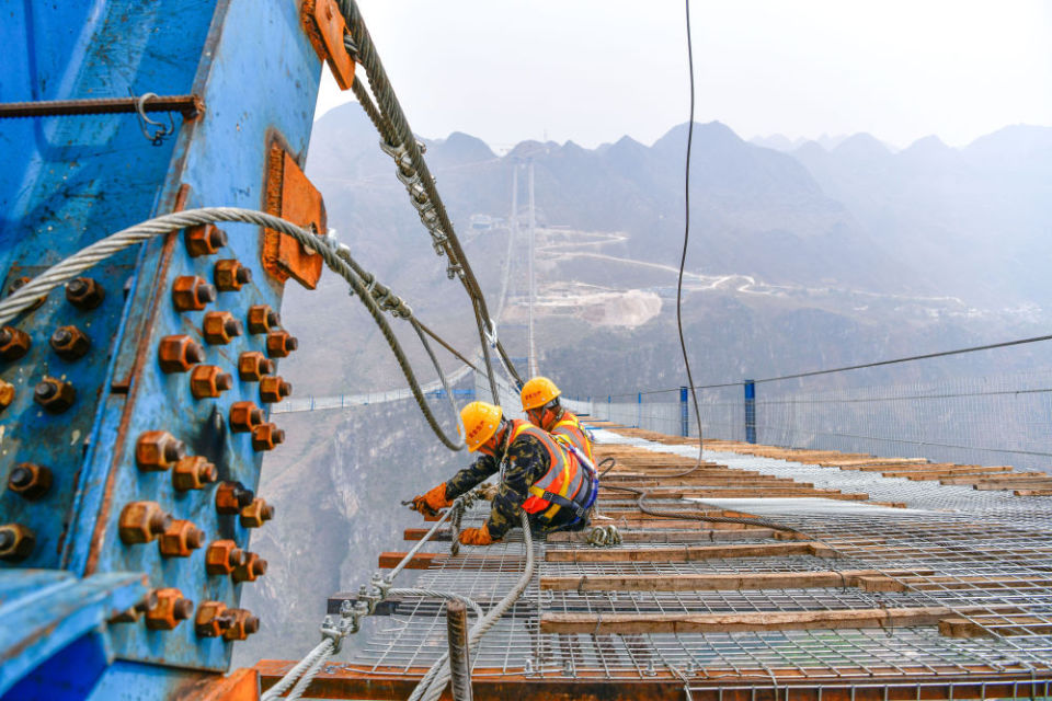 ↑ 2024年3月27日,工人在贵州花江峡谷大桥上加固施工猫道。新华社记者 杨文斌 摄