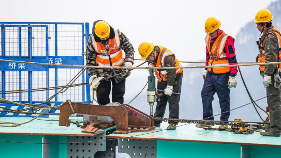 ↑ 2025年1月14日,工人在为吊装贵州花江峡谷大桥最后一个节段钢桁梁做准备。新华社记者 杨文斌 摄