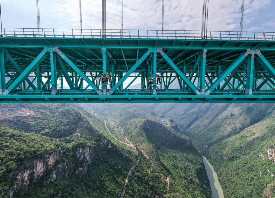 ↑ 2024年9月4日,工人在贵州花江峡谷大桥上施工。新华社记者 欧东衢 摄