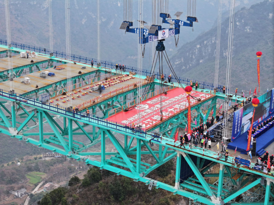 ↑ 2025年1月17日,工人在贵州花江峡谷大桥合龙现场施工。新华社记者 陶亮 摄