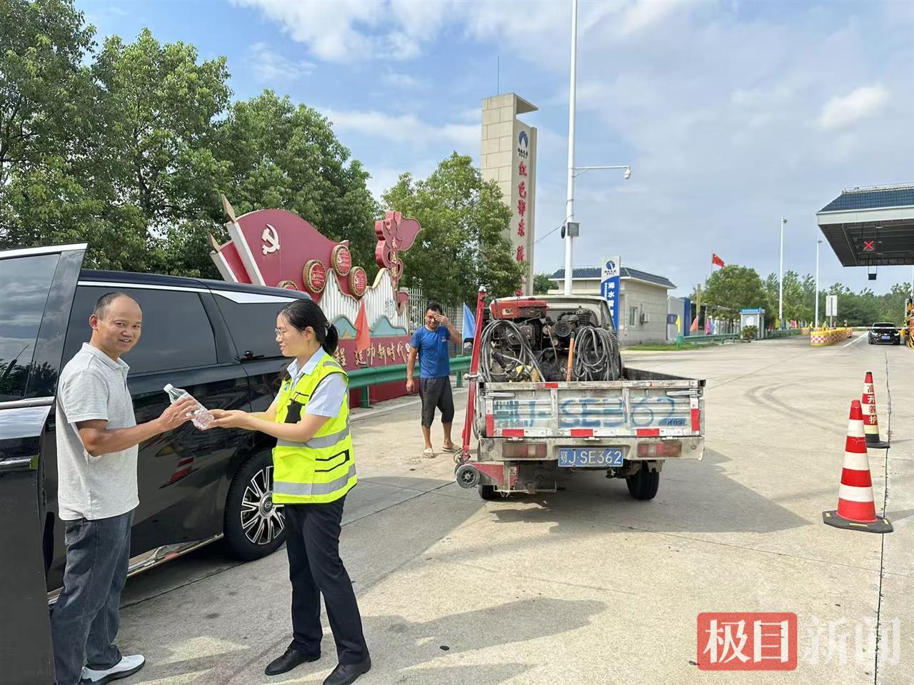 收费站的工作人员迅速发现了这一情况,主动上前询问是否需要帮助,并第一时间在故障车后方设置了反光警示锥,指挥后方车辆避让,确保现场安全。同时,工作人员主动为司机联系了专业救援维修服务,引导司机及乘客前往站内“爱心小屋”休息。小屋中,工作人员为乘客们提供了冰镇矿泉水和清凉湿毛巾,用细致入微的服务缓解了他们的焦躁情绪。