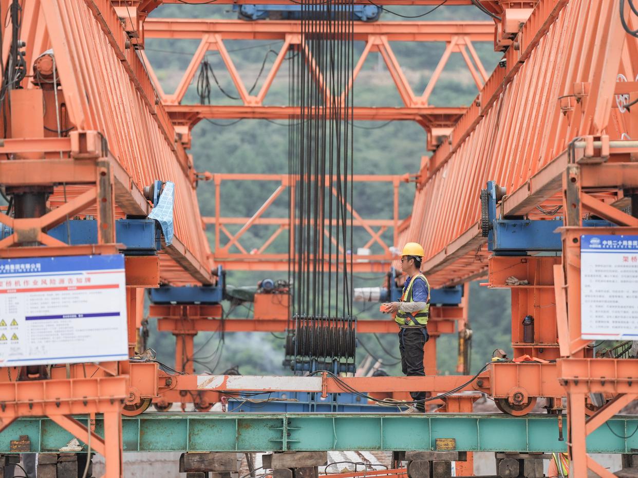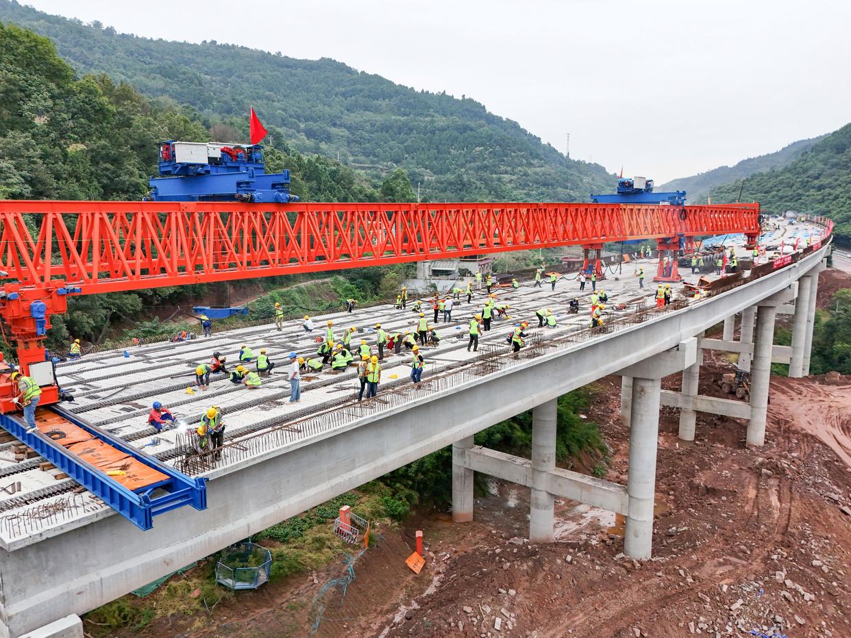 9月30日,工人在成(都)南(充)高速扩容工程叫化岩大桥进行架梁施工。新华社记者 王曦 摄