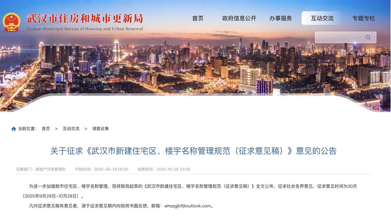 新闻记者获悉,为进一步规范新建住宅区及楼宇命名管理,武汉市近日发布《武汉市新建住宅区、楼宇名称管理规范(征求意见稿)》,面向社会公开征求意见。该意见稿对楼盘命名提出了一系列明确要求,旨在规范武汉市新建住宅区、楼宇名称管理。