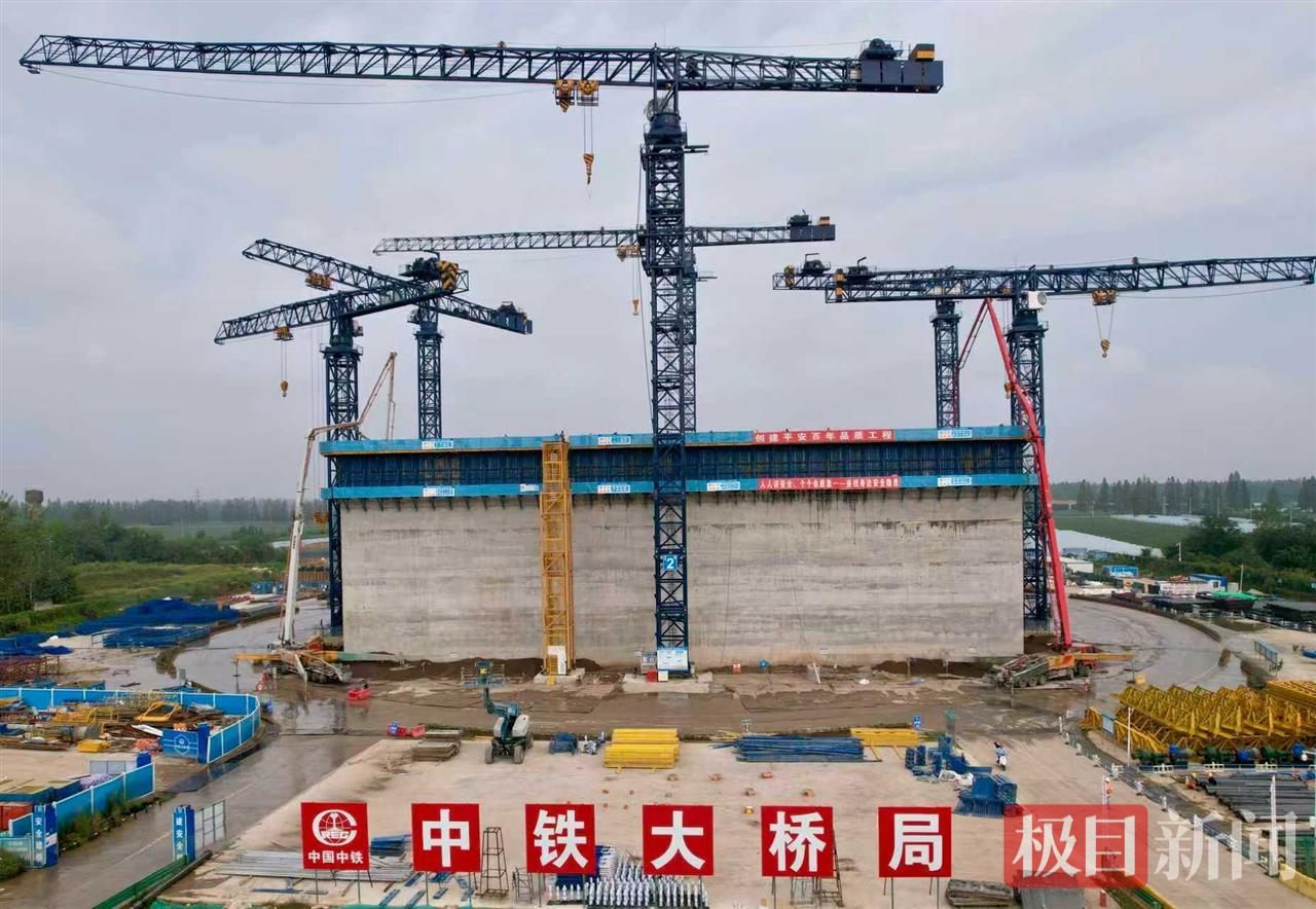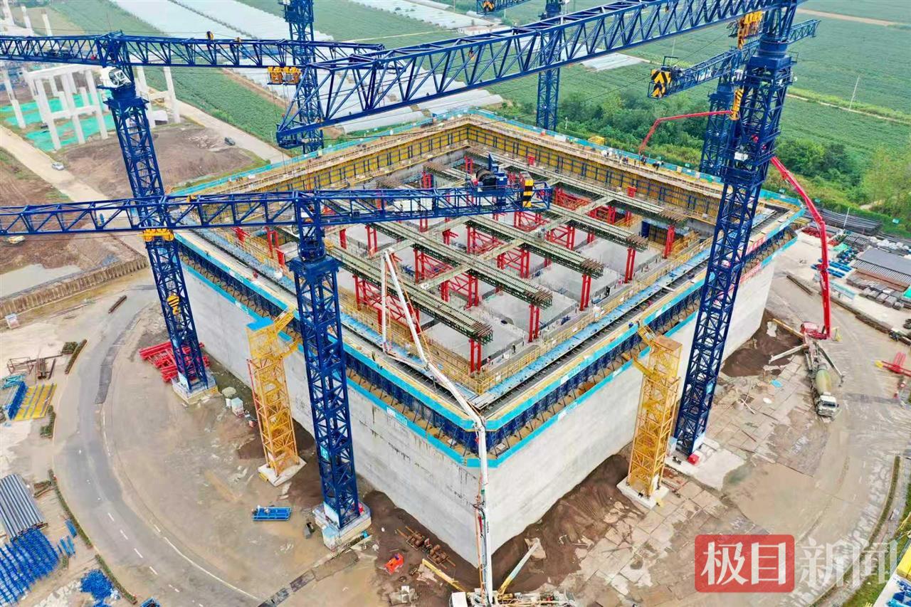 锚碇是一座大桥的“基石”,也是“定海神针”,由沉井和锚体组成,承担着固定桥梁缆索的巨大拉力。汉南长江大桥北锚碇采用整体式沉井基础,沉井平面尺寸为76.4米×76.4米的矩形,高43米,共分八节,中间布置36个矩形井孔,结构类似万形蜂窝煤。此次浇筑的第八节段总高度达8米,分为两次浇筑。