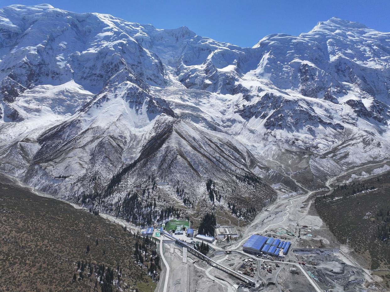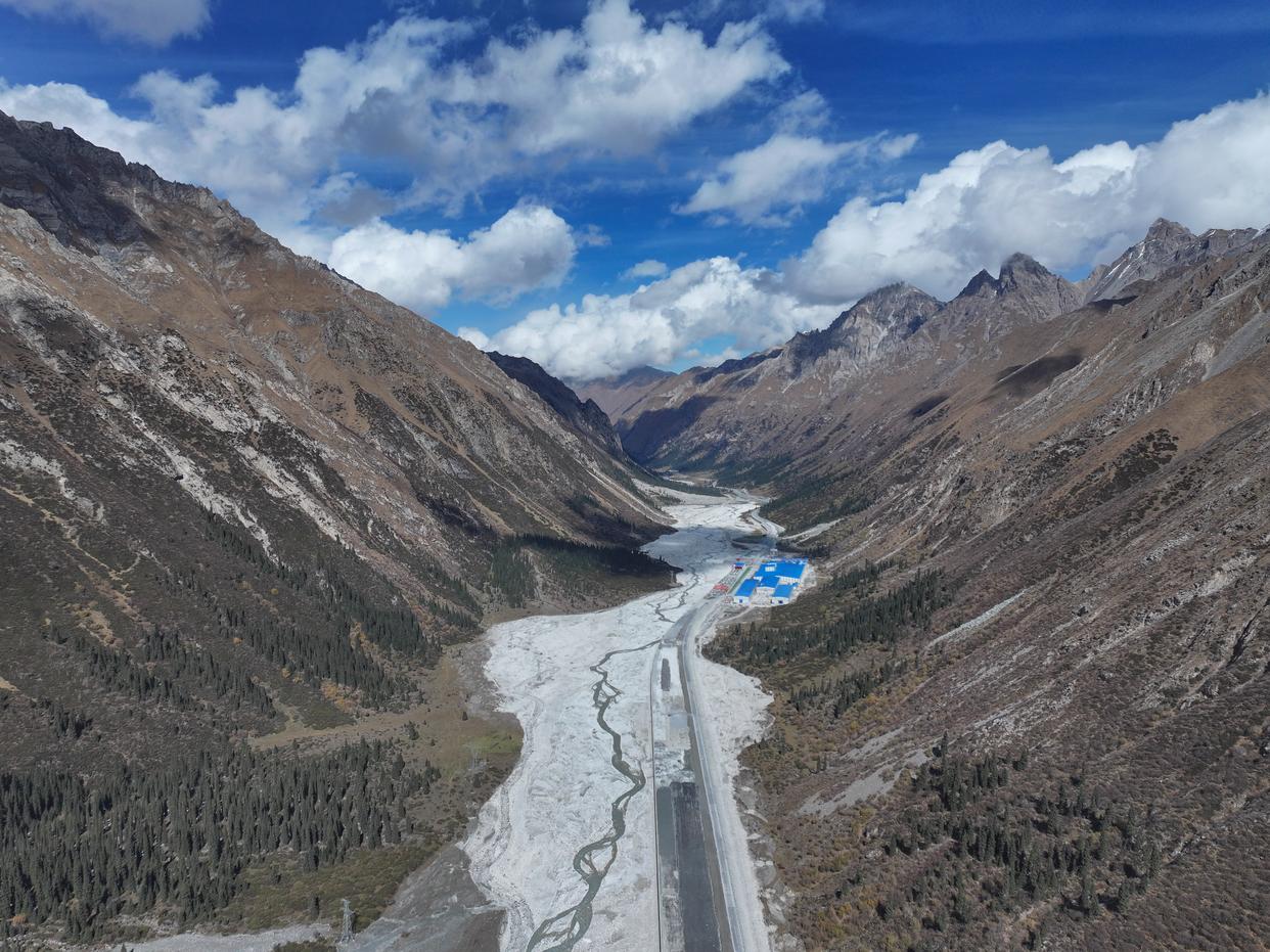 这是10月5日在新疆昭苏县拍摄的昭温公路西天山特长隧道进口端及附近施工现场(无人机照片)。该隧道为全线关键控制性工程,全长15.707千米,由北向南穿越天山山脉。新华社记者 胡虎虎 摄
