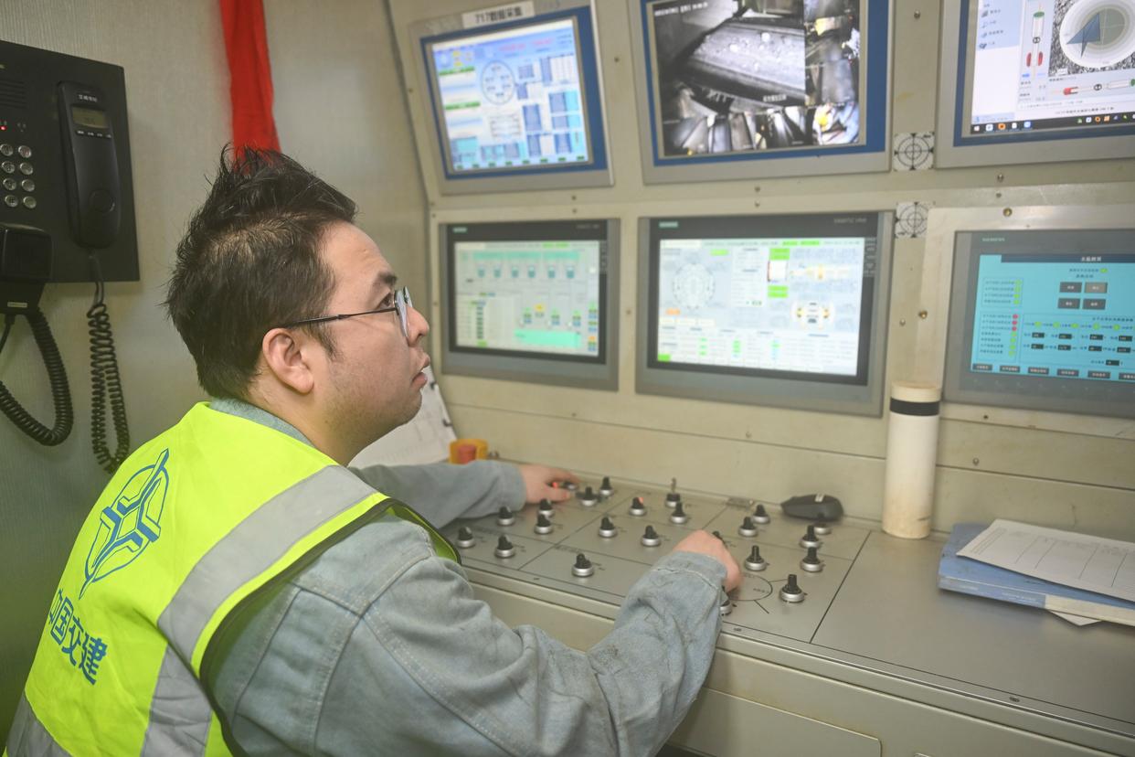 在昭温公路西天山特长隧道平导洞内,工人宗立贵在主控室操作硬岩掘进机(10月5日摄)。新华社记者 胡虎虎 摄