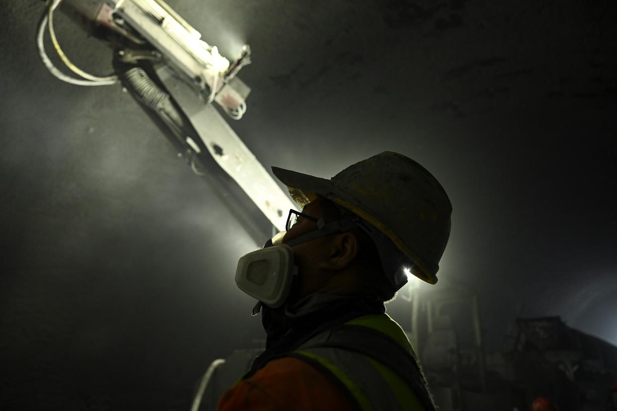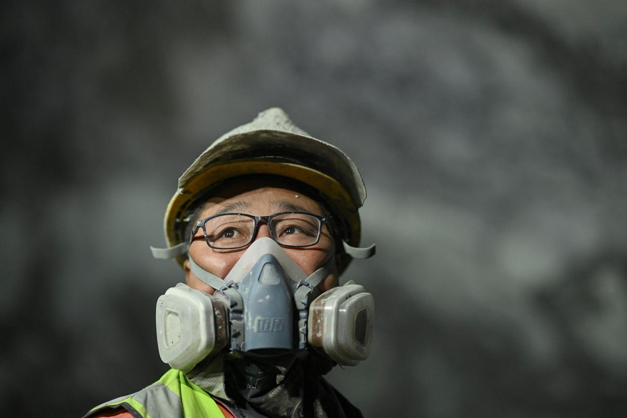 来自甘肃的工人王更兴在昭温公路西天山特长隧道左洞内施工(10月5日摄)。新华社记者 胡虎虎 摄