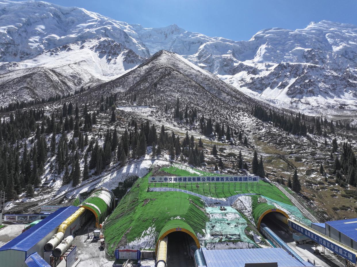 这是10月5日在新疆昭苏县拍摄的昭温公路西天山特长隧道进口端(无人机照片)。从左至右依次为平导洞、左洞、右洞。新华社记者 胡虎虎 摄