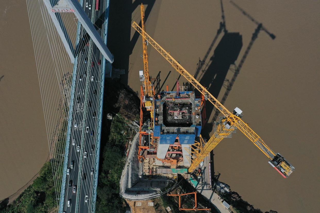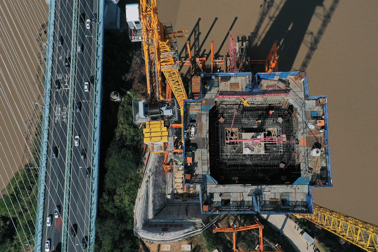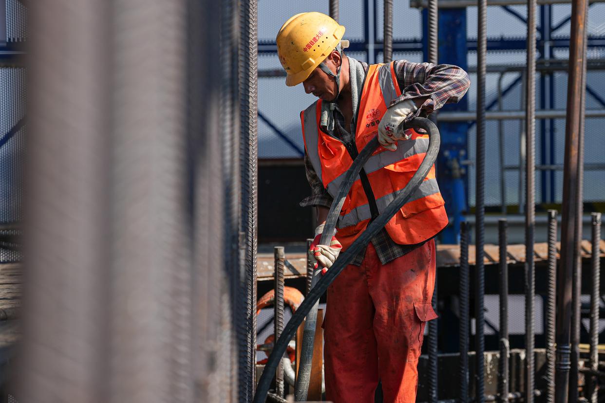 10月6日,建设者在甬舟铁路桃夭门公铁两用大桥6号主塔进行施工作业。新华社记者 黄宗治 摄