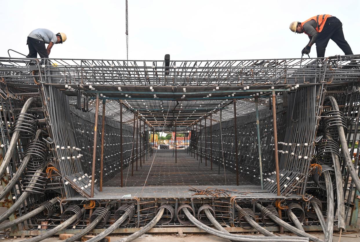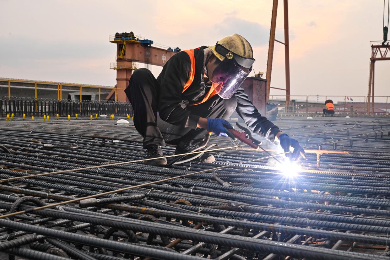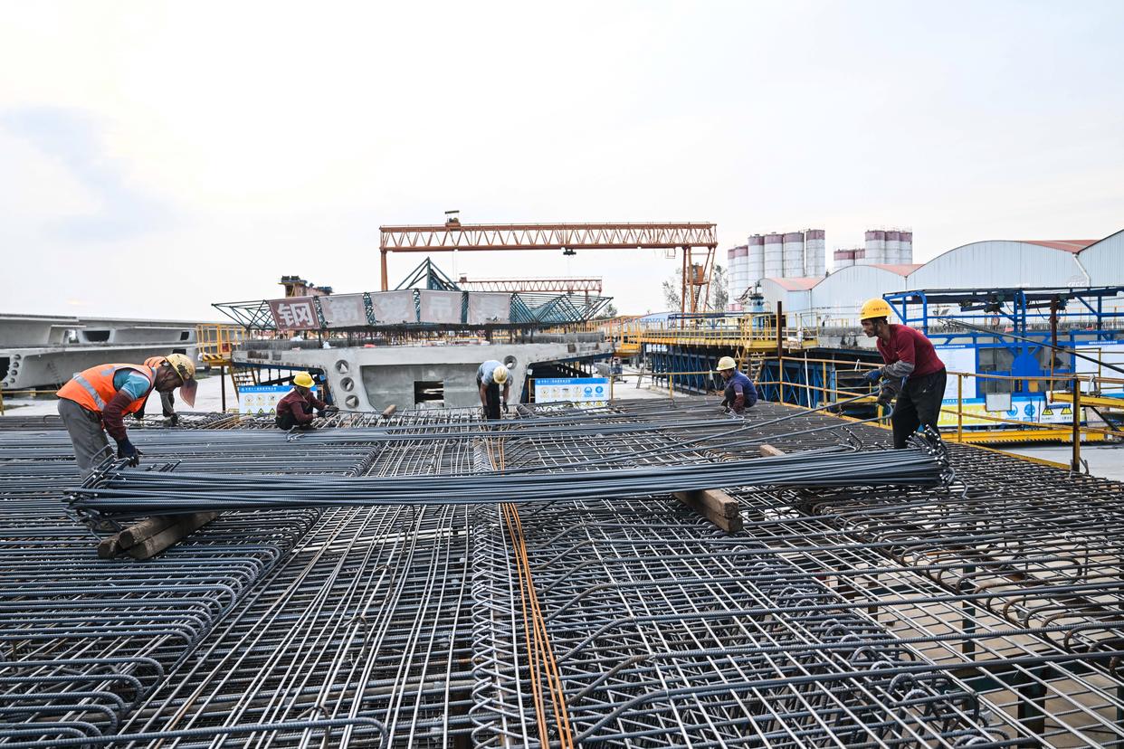 10月27日,工人在中铁十一局沪渝蓉高铁沪宁段搬经制梁场作业。新华社记者 季春鹏 摄