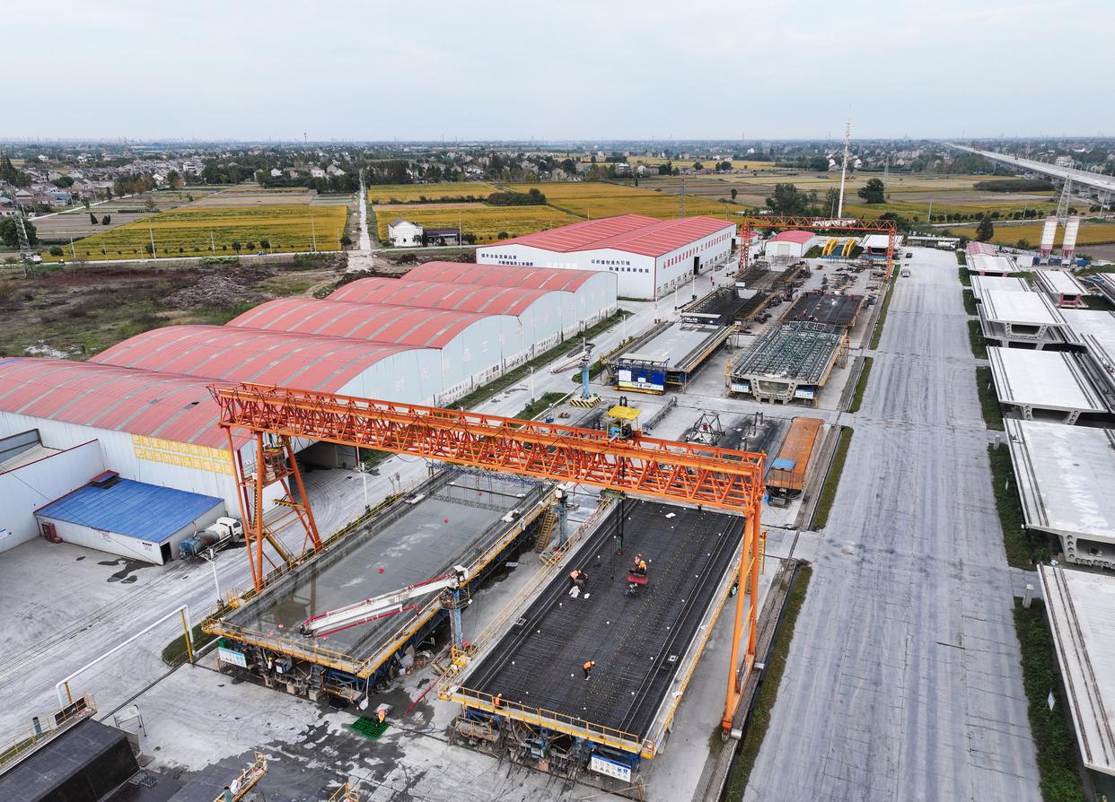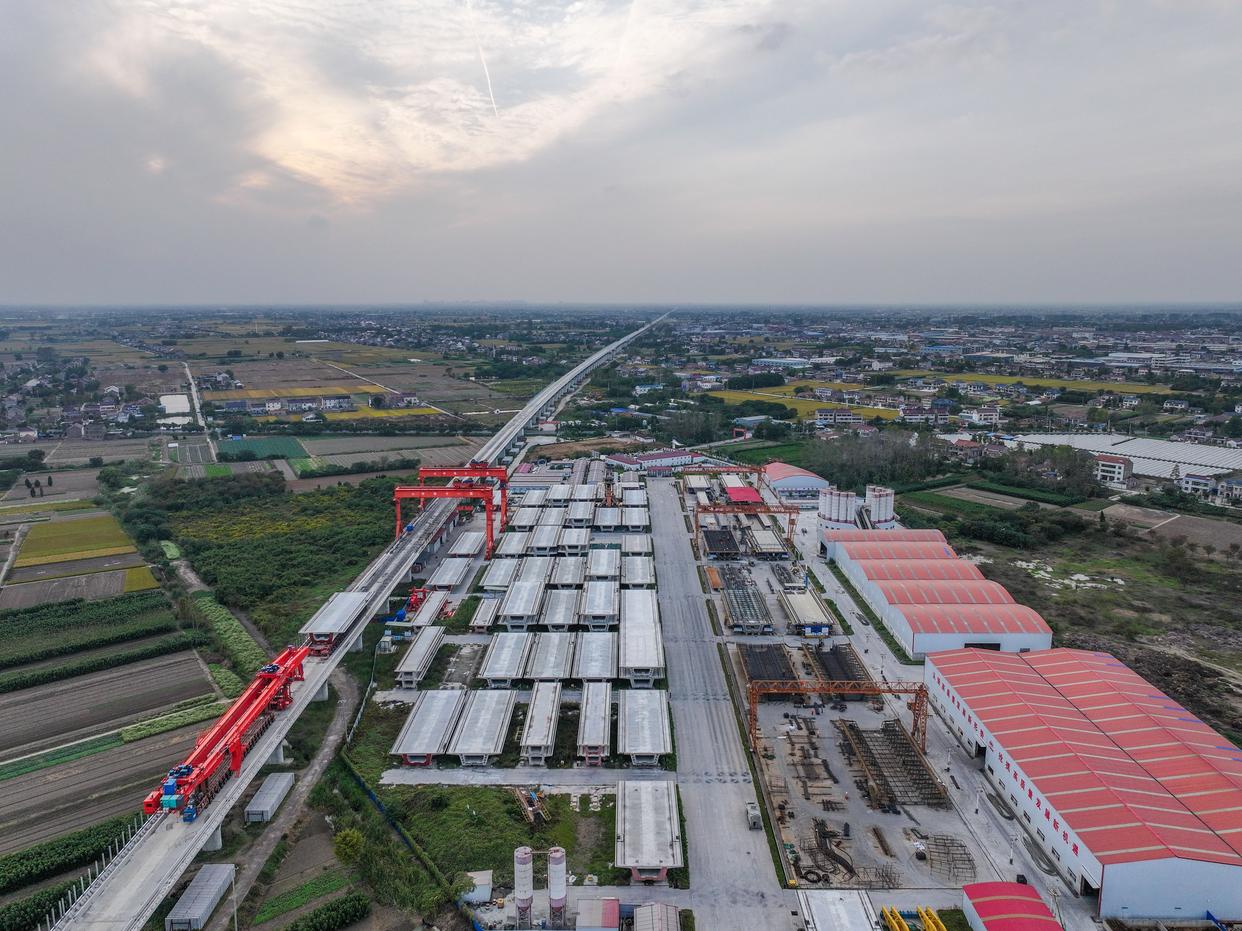 10月27日拍摄的中铁十一局沪渝蓉高铁沪宁段搬经制梁场作业现场(无人机照片)。新华社记者 季春鹏 摄