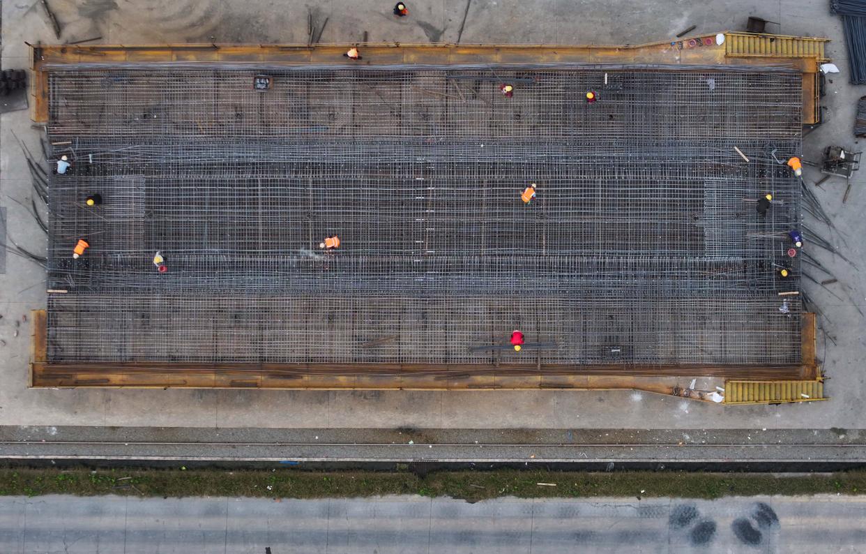 10月27日,工人在中铁十一局沪渝蓉高铁沪宁段搬经制梁场作业(无人机照片)。新华社记者 季春鹏 摄