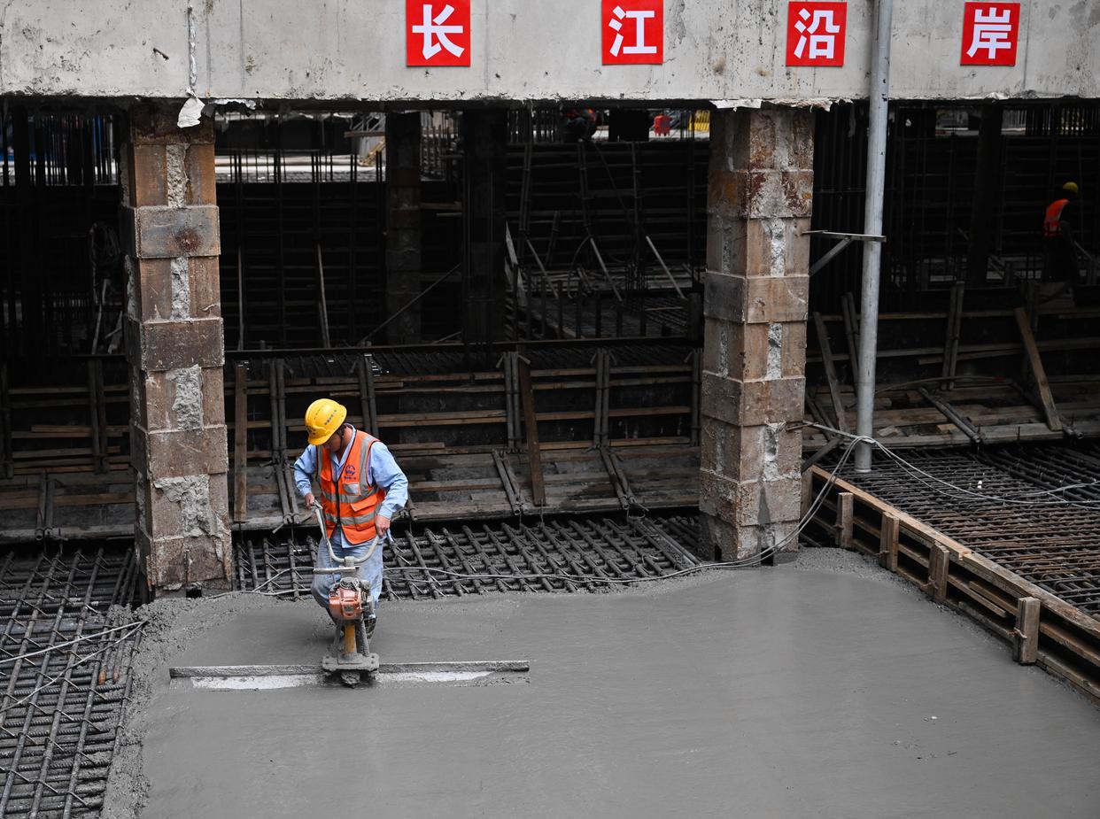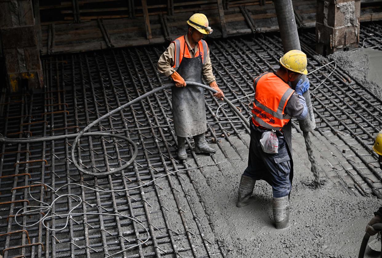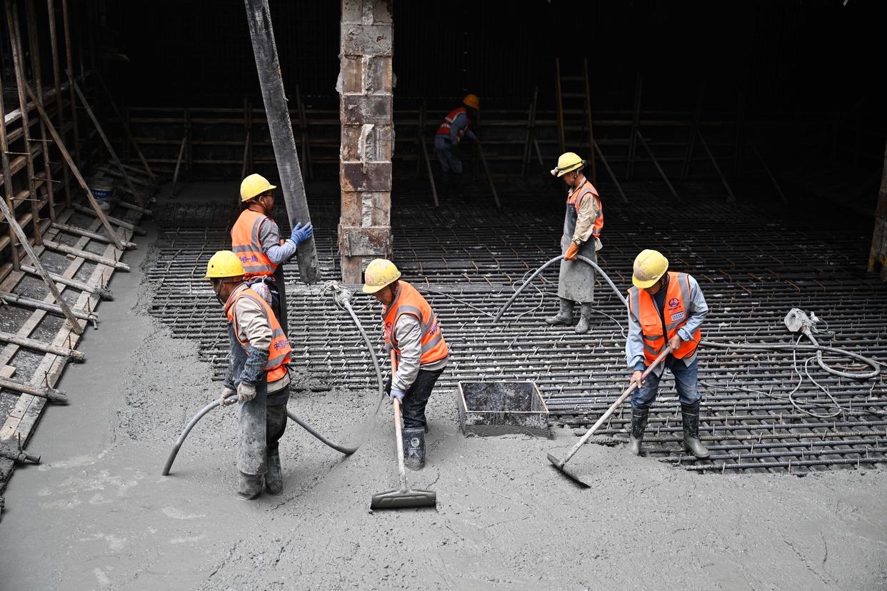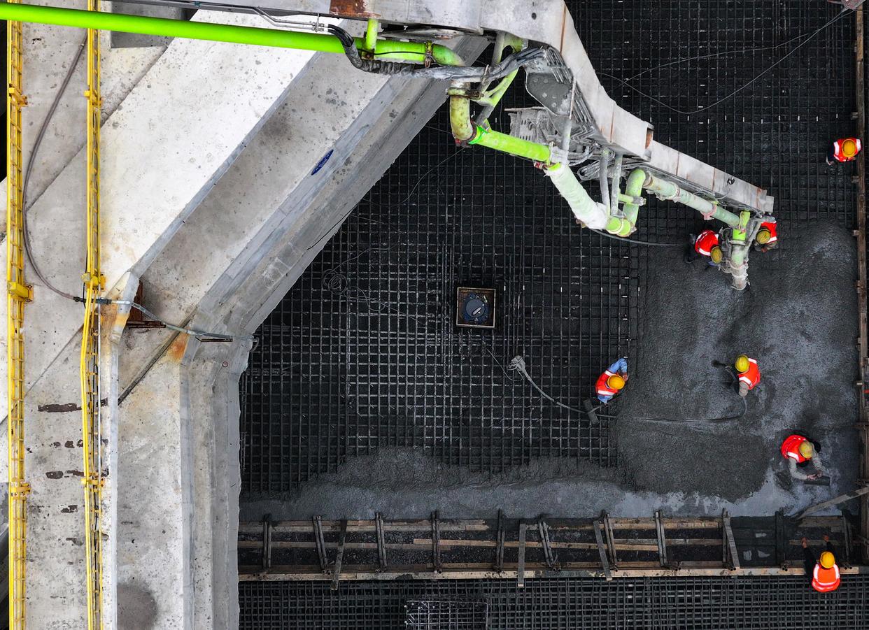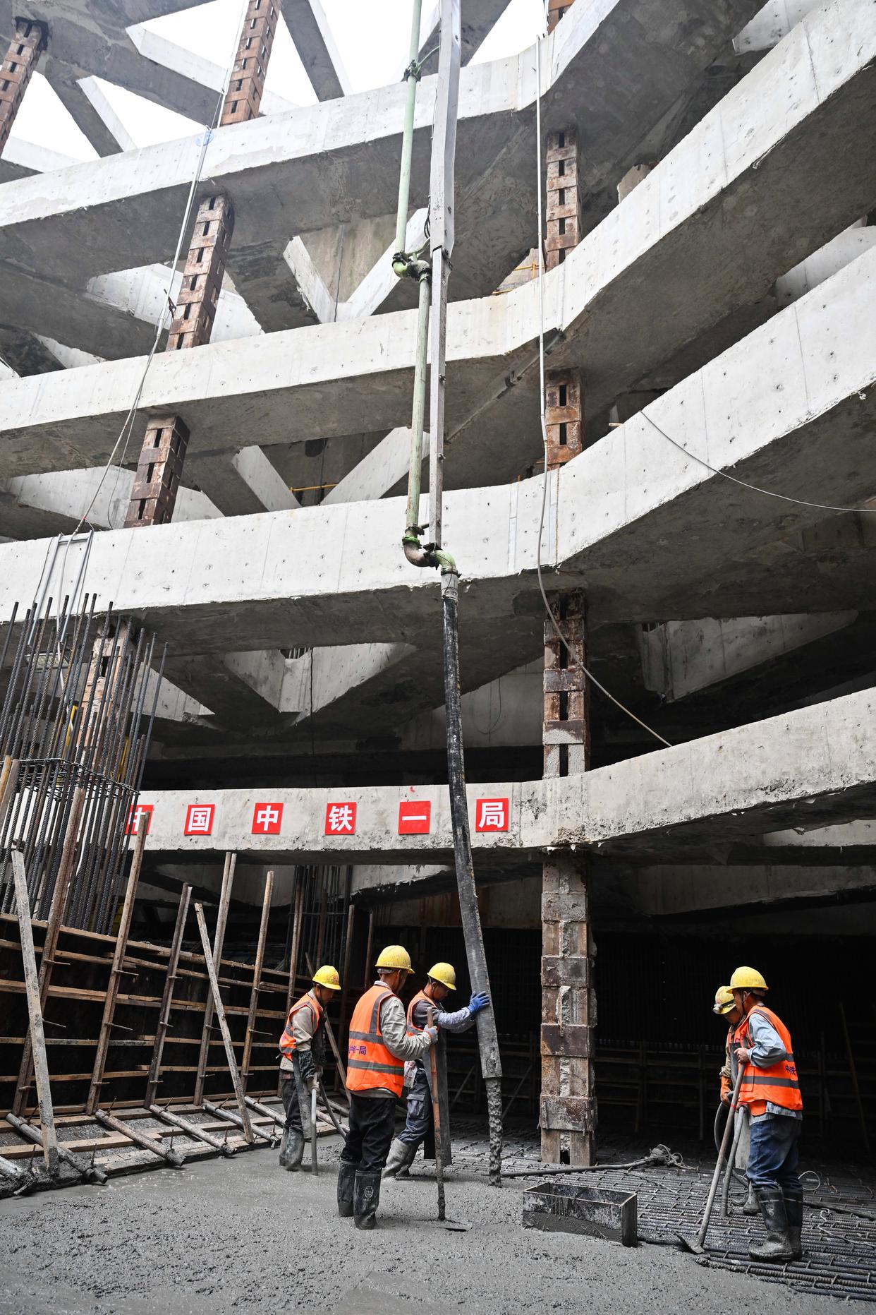 10月30日,工人在海门北站核心区基坑最后一块底板浇筑现场作业。新华社记者 季春鹏 摄