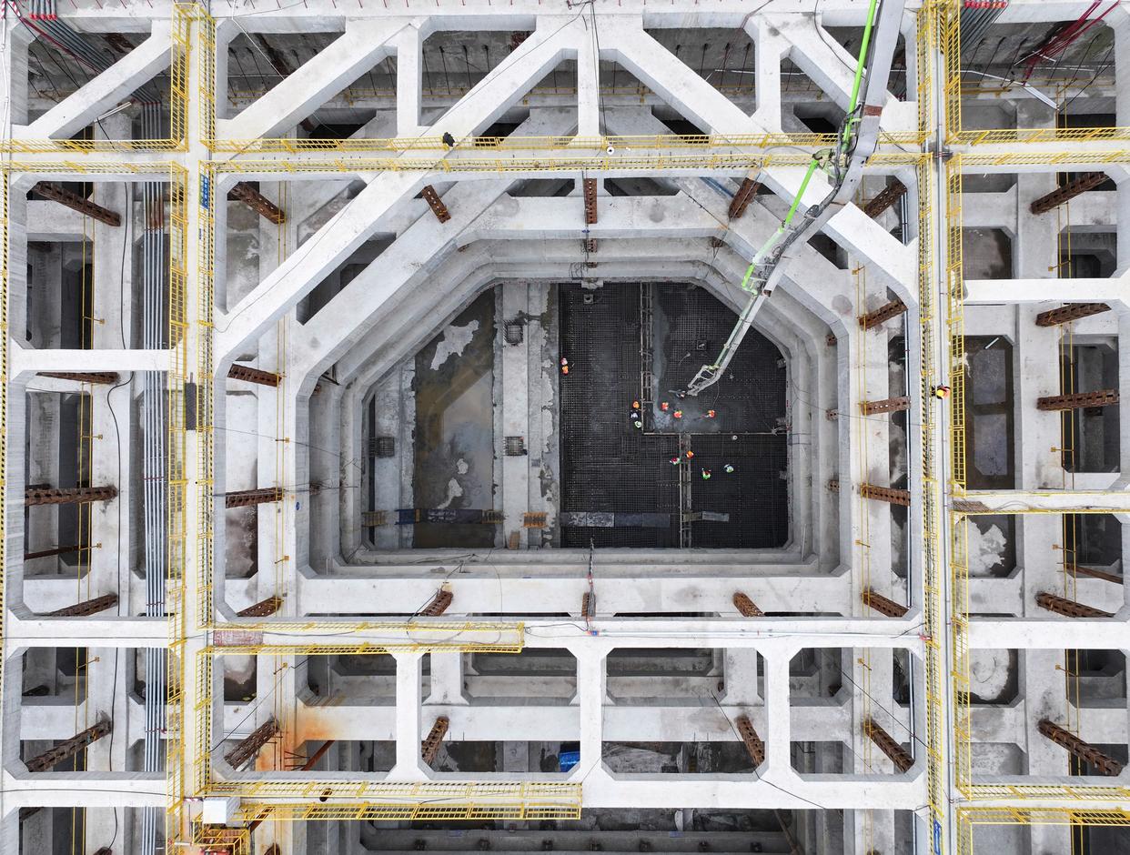 10月30日,工人在海门北站核心区基坑最后一块底板浇筑现场作业(无人机照片)。新华社记者 季春鹏 摄