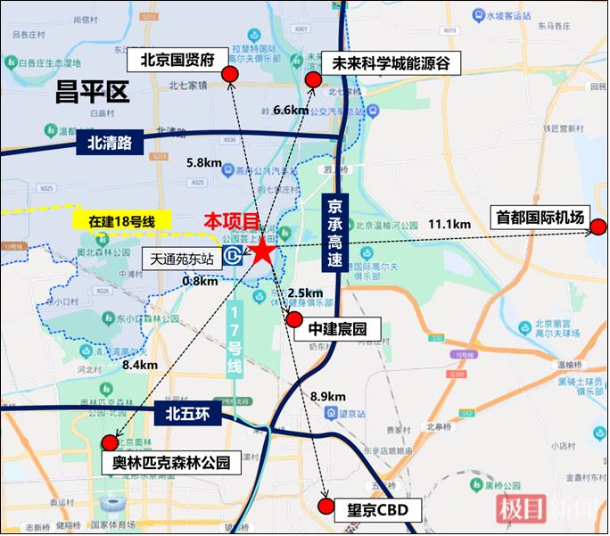 项目位于北京市昌平区天通苑板块,地处北五环至北六环之间,临近北苑东路、来广营北路等城市主次干道,距离地铁17号线与18号线(在建)换乘站天通苑东站直线距离约0.8公里,双轨交会、自驾便捷,距中建宸园项目约2.5公里,距北京国贤府项目约5.8公里。