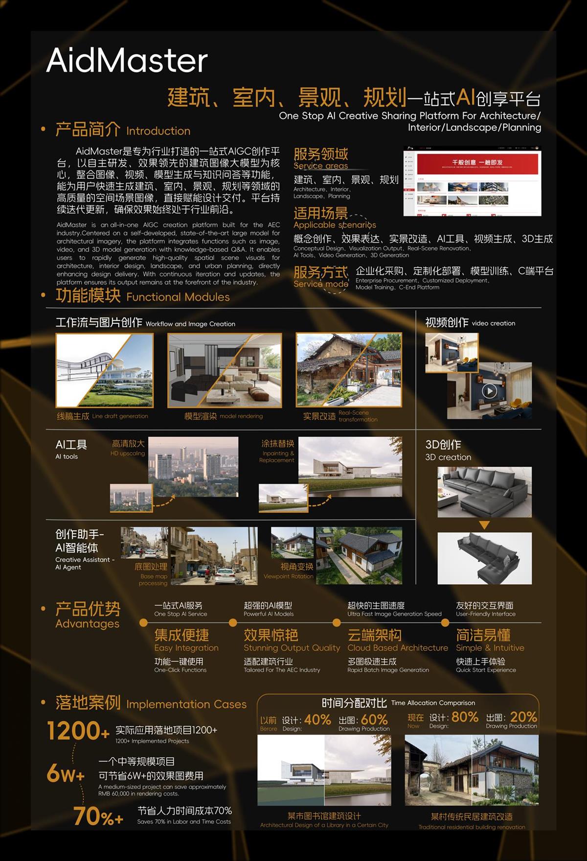 据悉,AidMaster图灵是一个基于自研生图大模型打造的AIGC创享平台。其底层模型经过百万级建筑设计数据和10W+真实项目素材的深度训练,并严格区分为建筑、室内、景观、规划四大专业设计模板,细分为超过100种具体业态与场景。