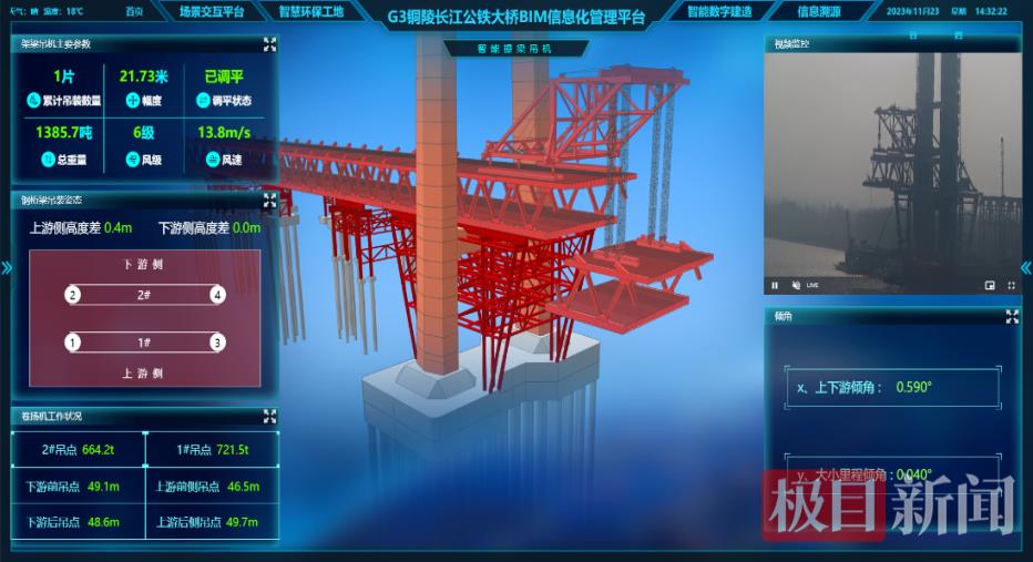 桥科院利用中铁大桥局云平台,结合BIM、物联网、互联网、GIS、智能传感等系列技术,实现BIM技术在项目的深度应用,研发了系列环境感知装备,推出了边辅跨钢梁提梁、钢梁顶推、主缆架设过程的数字化监管系统,设计了多种水上风险监测信息化模块,实现了架梁吊机转运等多项高难度作业智能化控制。相关技术不仅可以对全项目进行可视化展示,还能实时监测结构受力状态,实现风险智能播报与预警,为大桥建设保驾护航。