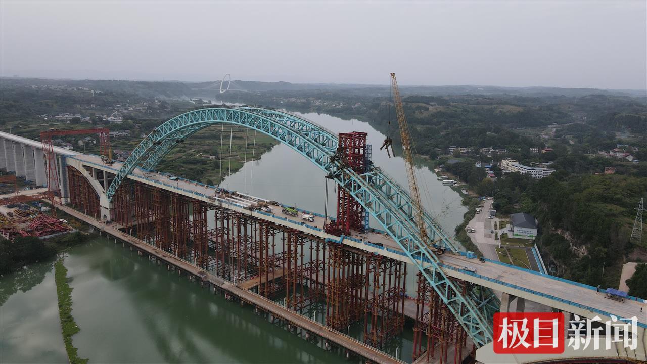 主拱提升合龙是全桥建设难度最高、风险最大的难题,主拱重2200吨、长174米、提升21.7米,提升过程中拱肋4吊点高差不能超过20毫米,堪比“空中绣花”。建设团队引入自动化监控、数字化管理平台,应用虚拟拼装技术,反复模拟演练,实时采集受力与位移数据,精准提升合龙速度与姿态,确保合龙精度达标。“在施工现场,主拱提升达焊接点时,最高处距江面达103米,8名电焊工同时施焊,在数字化管理平台监控下精准焊接32个环口,合龙精准度与模拟结果高度一致。”长江沿岸铁路集团四川有限公司成渝中线指挥部指挥长王学生感叹道。