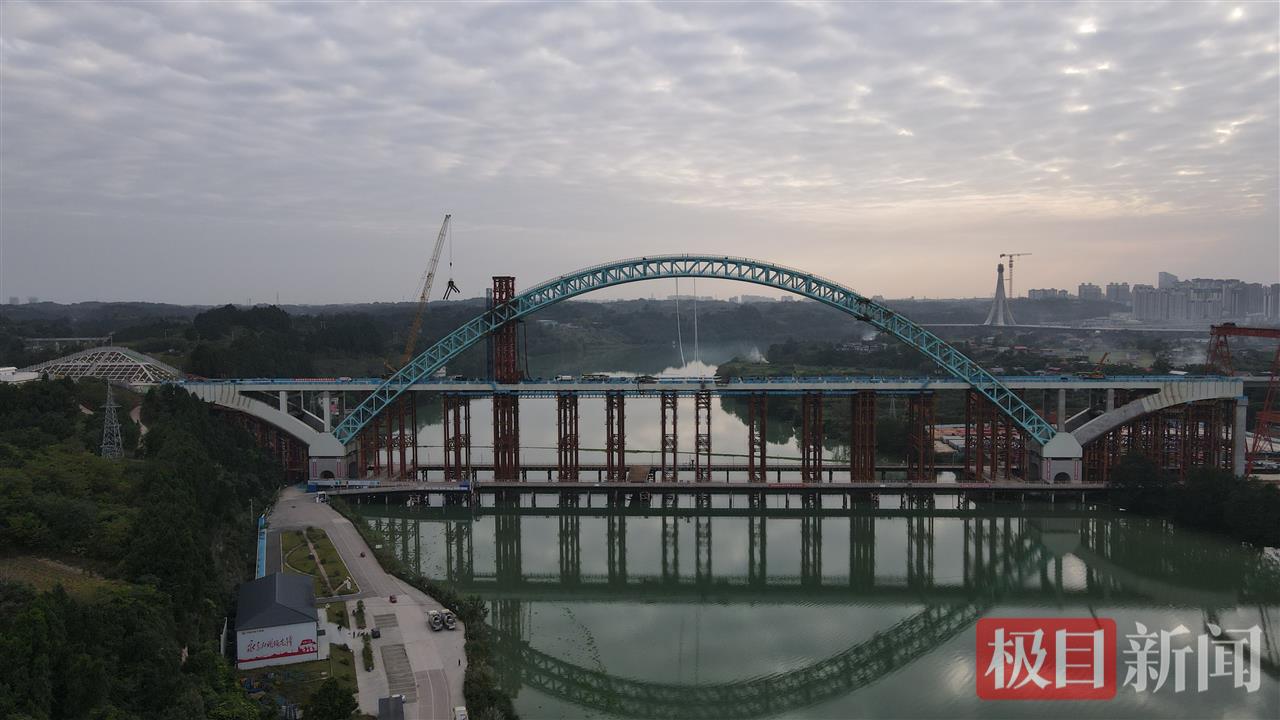 为此,中铁二院组织专家团体反复调研论证,创新设计了飞燕式双排支座无推力拱桥结构体系,在该结构体系下深化研究后又创新设计了“钢箱-混凝土混合边拱+钢管混凝土主拱+双边箱钢梁兼做系杆”组合结构拱桥,是世界最大跨度无推力组合拱桥。“这一全新设计让大桥如同‘巨弓’横跨沱江,形成‘无推力’自平衡稳定结构,在均衡安全性、经济性和施工可行性上实现了‘最优解’,为世界桥梁建设提供新范本。”中铁二院工程师彭福兵介绍。