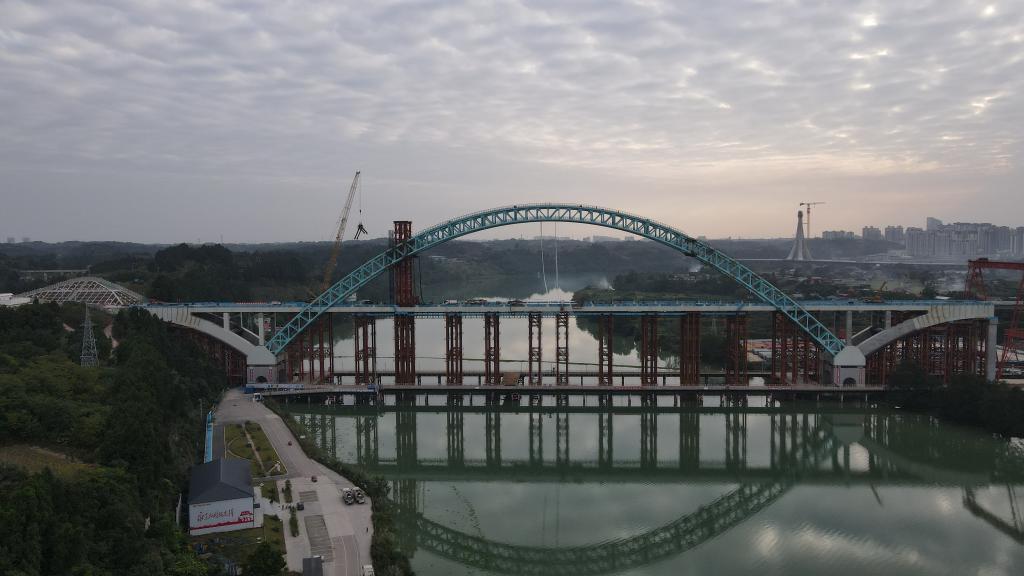 “沱江两岸基岩以泥岩和砂岩为主,地基无法承受巨大水平推力,通过创新设计飞燕式双排支座无推力拱桥结构体系,让大桥如同‘巨弓’横跨沱江。”设计方中铁二院工程师彭福兵介绍。