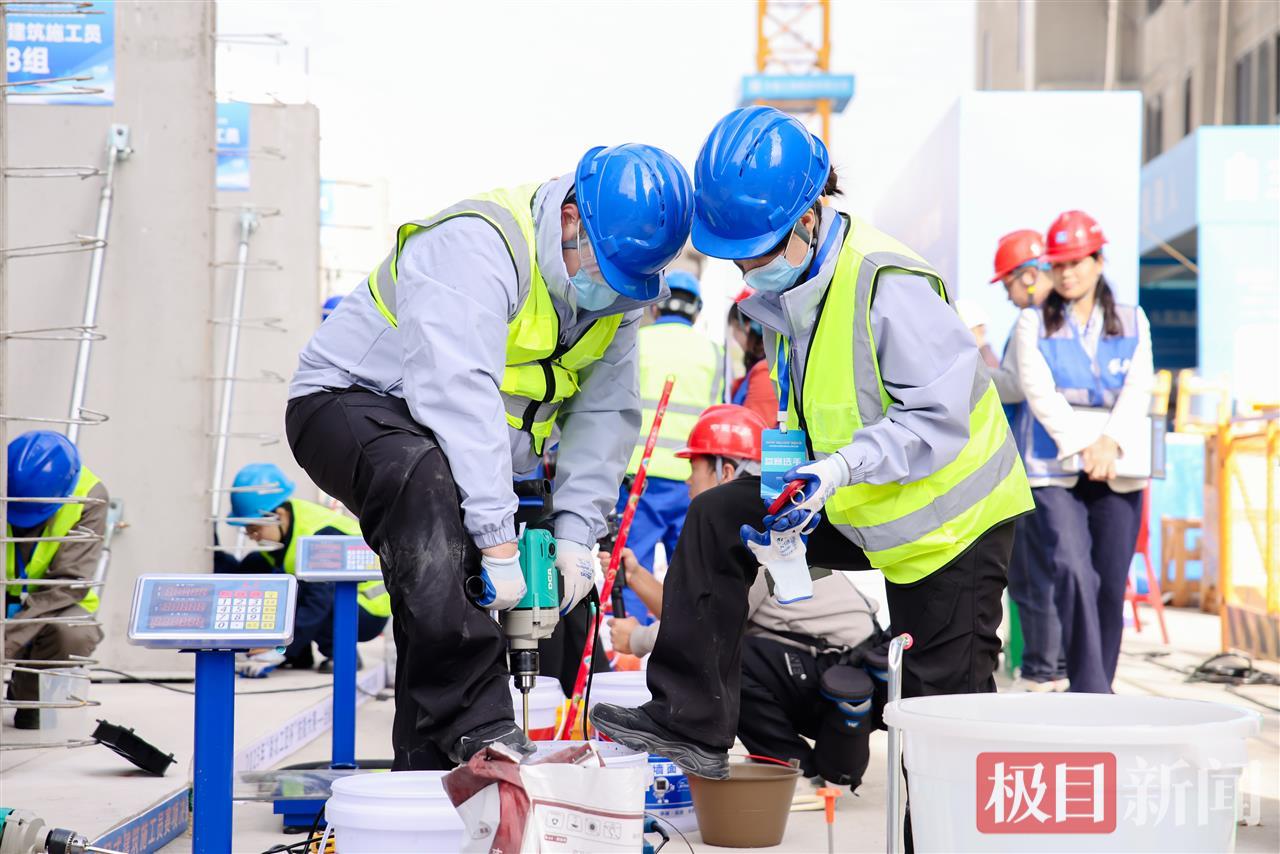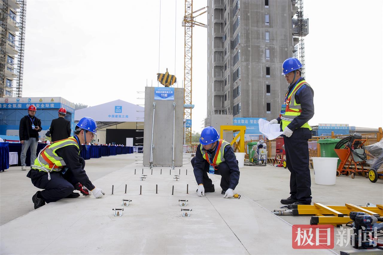 新闻记者现场看到,选手们首先需要将上方构件底面的定位套筒,精准地插在下方构件的定位钢筋上,这一步就让“积木”拼在了一起,但要让“积木”完全融为一体,还需进行套筒灌浆。他们先用高强度材料进行接缝封堵,再按规定比例用水与灌浆材料调配好浆料,将浆料注入预制构件的灌浆孔中,待浆料从出浆口流出后封堵出口,检查无渗漏后便完成了灌浆操作,将装配式建筑的两个结构连接在了一起。