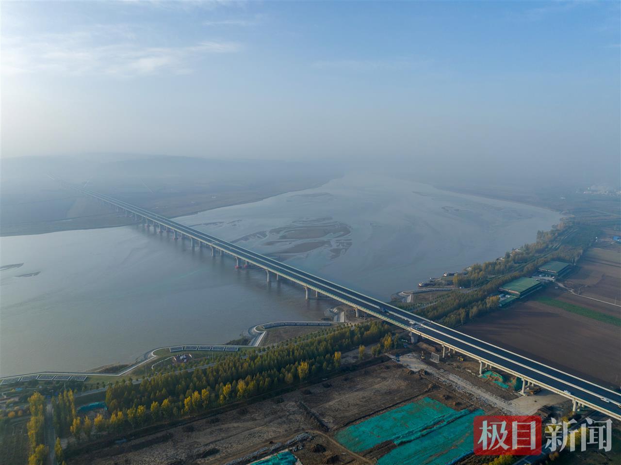 项目控制性工程黄河特大桥主桥主桥全长2585米,采用双向六车道设计,设计时速120公里,是国内同类高速公路中设计时速最高的大型桥梁之一。大桥主梁为槽型钢混组合梁结构,采用国际上最先进的步履式顶推施工工艺,其中单向最大顶推距离达1285米,顶推单跨达到100米,是国内顶推距离最长、单跨顶推距离最大的桥梁之一。