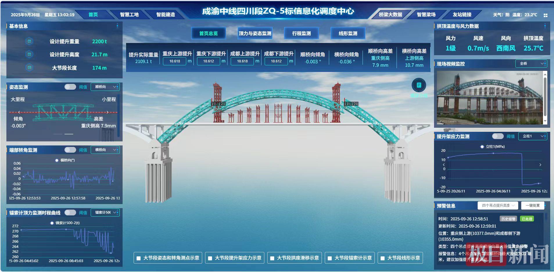 面对沱江特大桥主拱提升过程中重达2200吨、长174米的大节段,桥科院开发了钢管拱大节段提升智能预警系统。该系统通过多种传感器和无人机自动巡航,对拱肋提升进行实时监测,确保各项数据始终控制在安全范围内。