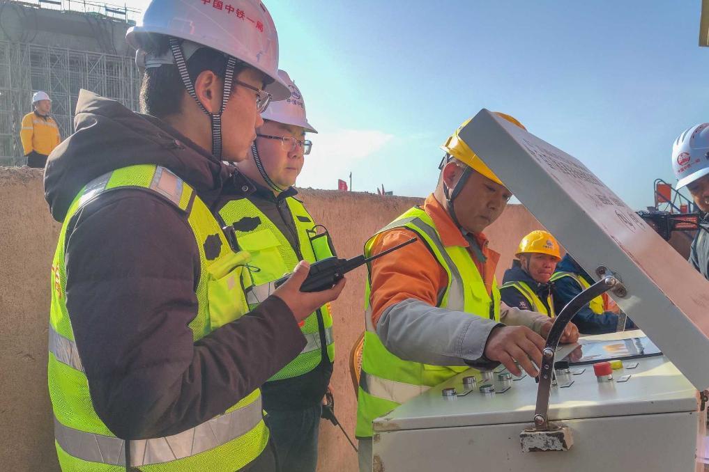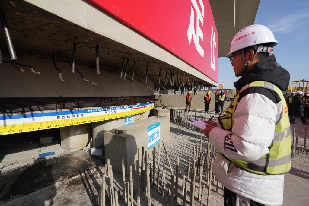 11月18日,G30连霍高速哈吐段改扩建工程上跨兰新铁路1号大桥T形刚构连续梁转体现场,工作人员正在记录桥梁转体数据。新华社记者 阿曼 摄