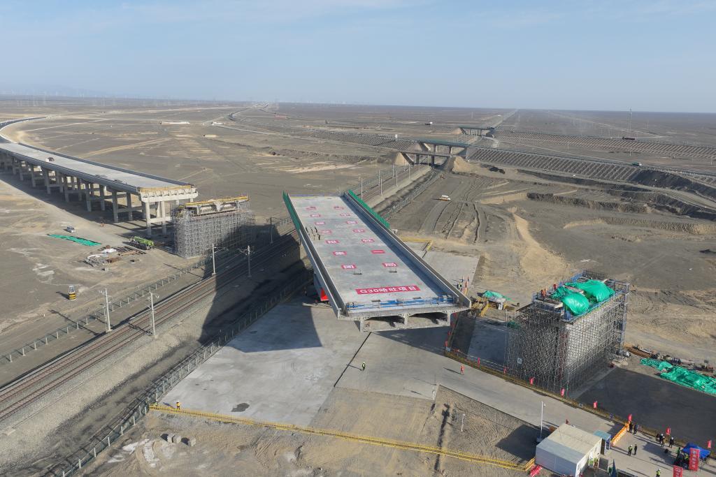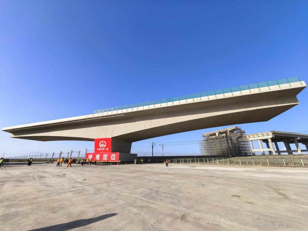 11月18日,G30连霍高速哈吐段改扩建工程上跨兰新铁路1号大桥T形刚构连续梁正在转体。新华社发