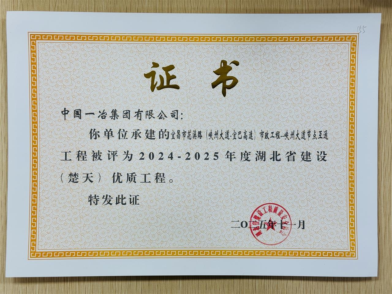 11月18日,由中国一冶承建的宜昌市花溪路(峡州大道-宜巴高速)市政工程一标段——峡州大道节点互通工程,获得2024—2025年度湖北省建设(楚天)优质工程奖,这是湖北省建筑工程质量领域的最高荣誉。