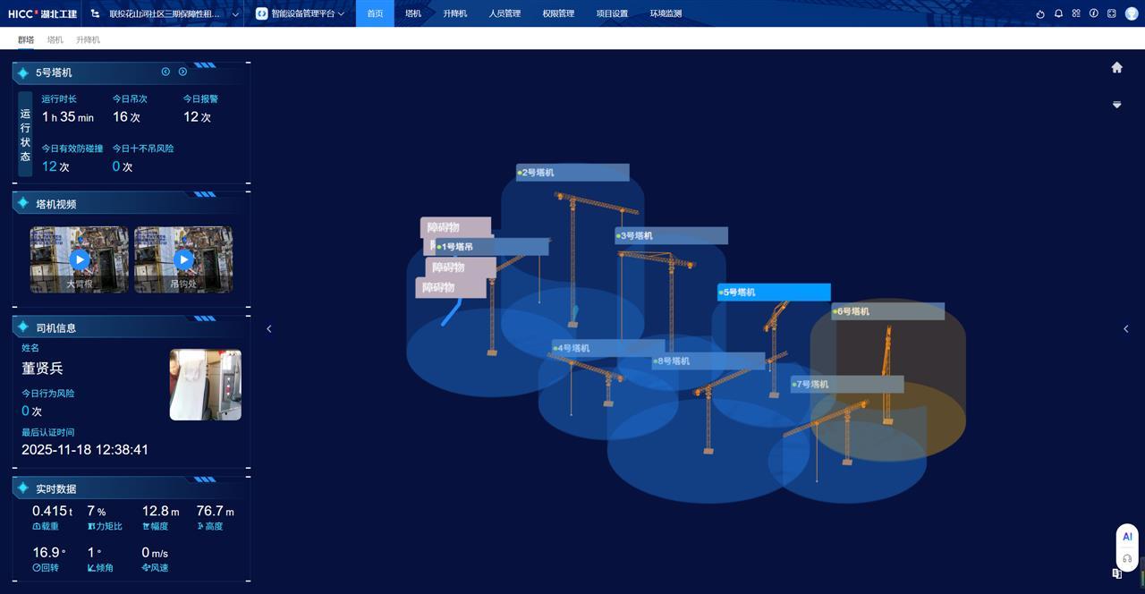 AI赋能群塔作业安全和塔司体验。项目技术总工邵琪表示,现场8台塔吊均部署群塔防碰撞版塔机监测系统,具有碰撞风险预警、主动制动干预、吊钩附近人员保护、隐患闭环管理的功效。系统上线后,司机室紧急制动率由月均11次降至0次。