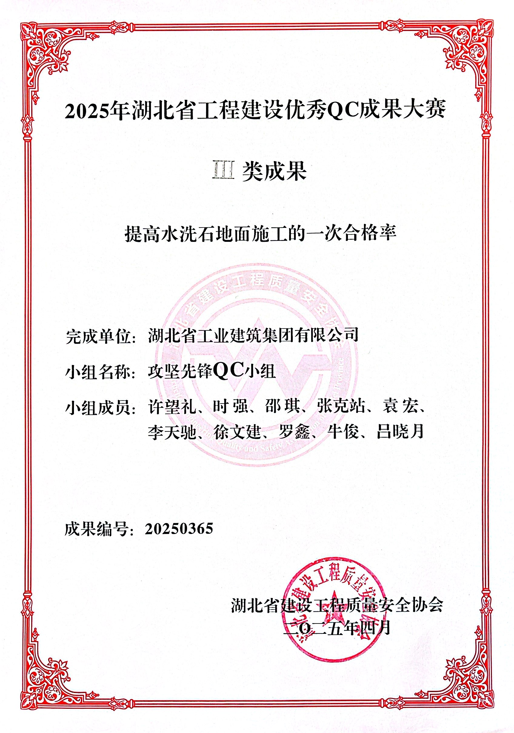 据介绍,项目先后获得2025年湖北省工程项目管理数字化竞赛决赛一类成果、广联达塔机安全监测系统应用标杆项目、2025年湖北省工程建设优秀QC成果大赛三类成果《提高水洗石地面施工的一次合格率》。